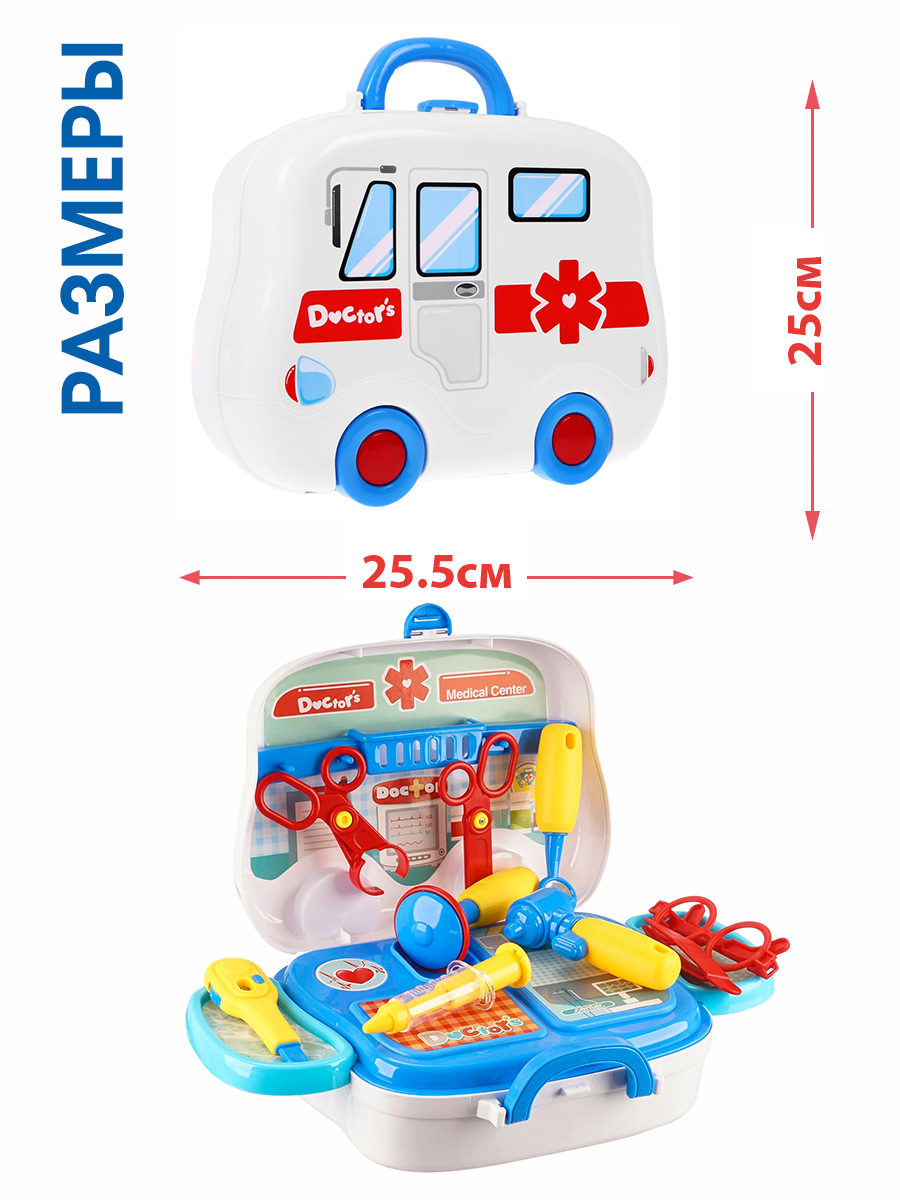 | Комплектация | пластиковый чемоданчик с ручкой и ремешком, молоточек, стоматологическое зеркало, ножницы, очки, отоскоп, пинцет, зажим, градусник, шприц, 2 полочки и держатель с крючками для инструментов |