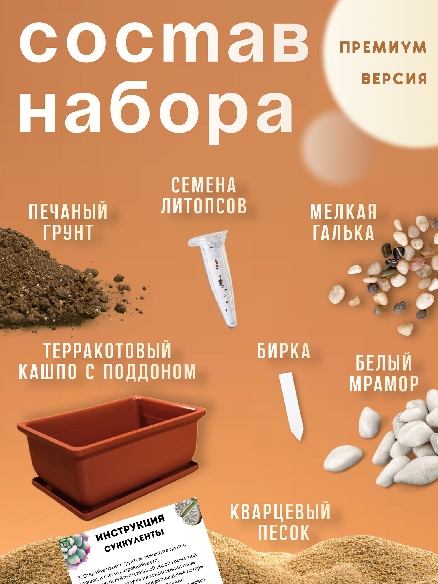 | Комплектация | Горшок с поддоном; грунт; галька; мраморная крошка; песок; бирка; семена; инструкция |