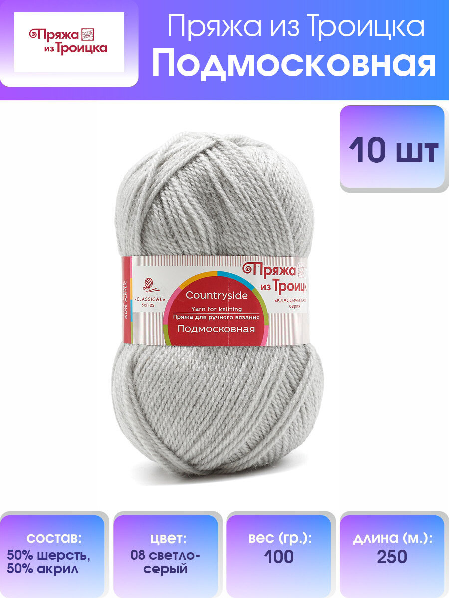 Пряжа для вязания из Троицка 'Подмосковная', 100г, 250м (50% шерсть, 50% акрил) (08 светло-серый), 10 мотков информация: