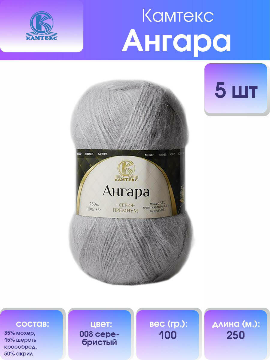 Пряжа для вязания Камтекс 'Ангара', 100 г, 250 м (35% мохер, 15% шерсть кроссбред, 50% акрил) (008 серебристый), 5 мотков информация: