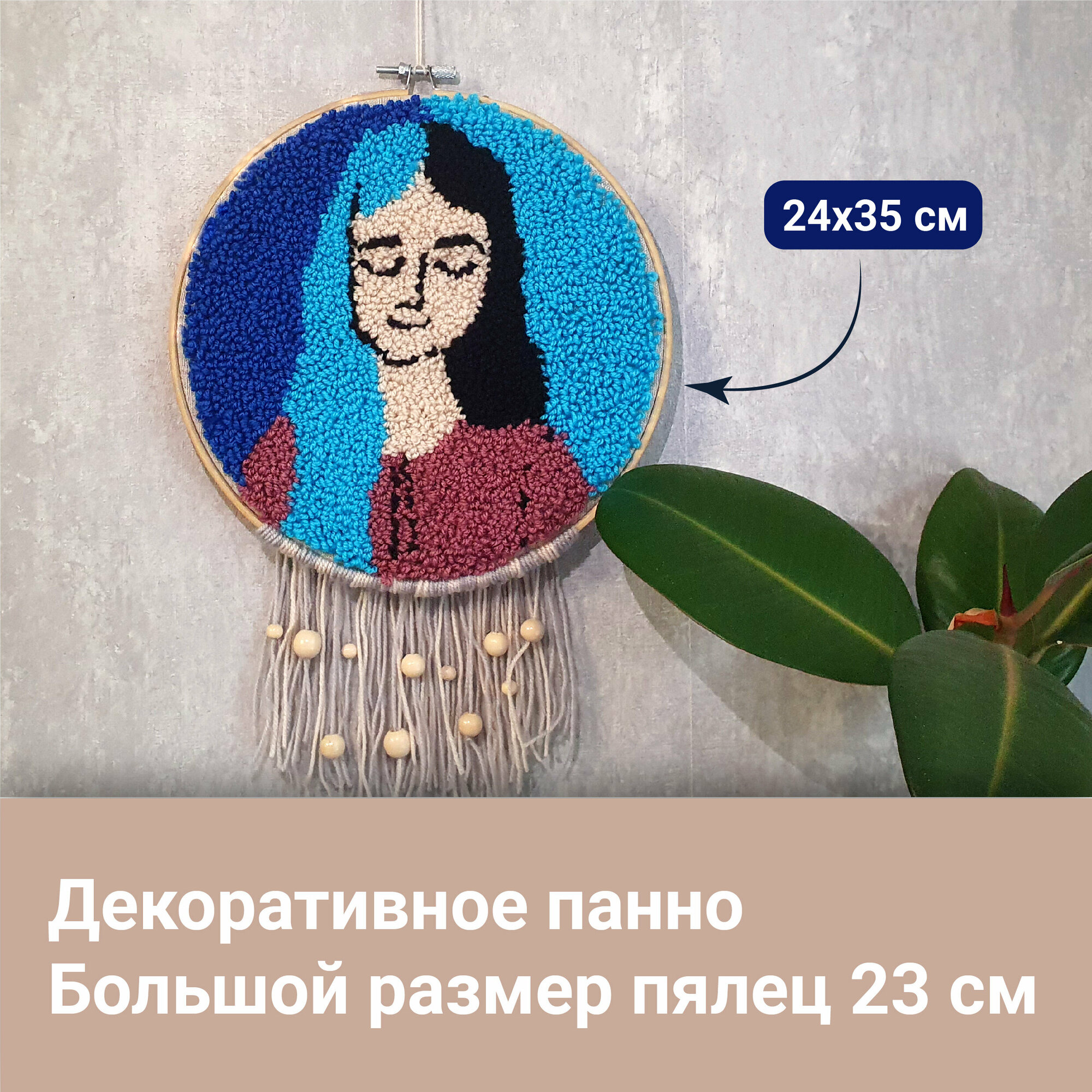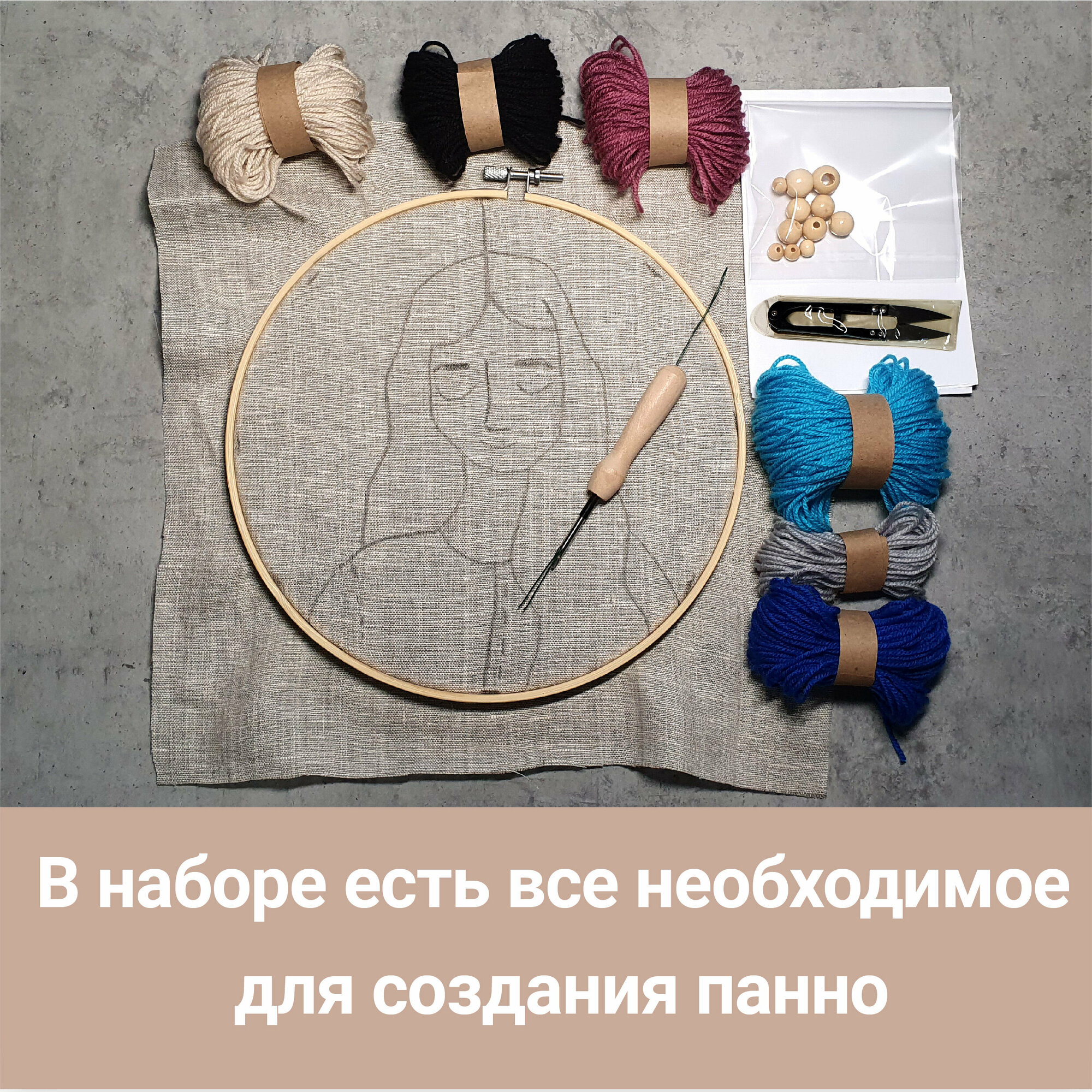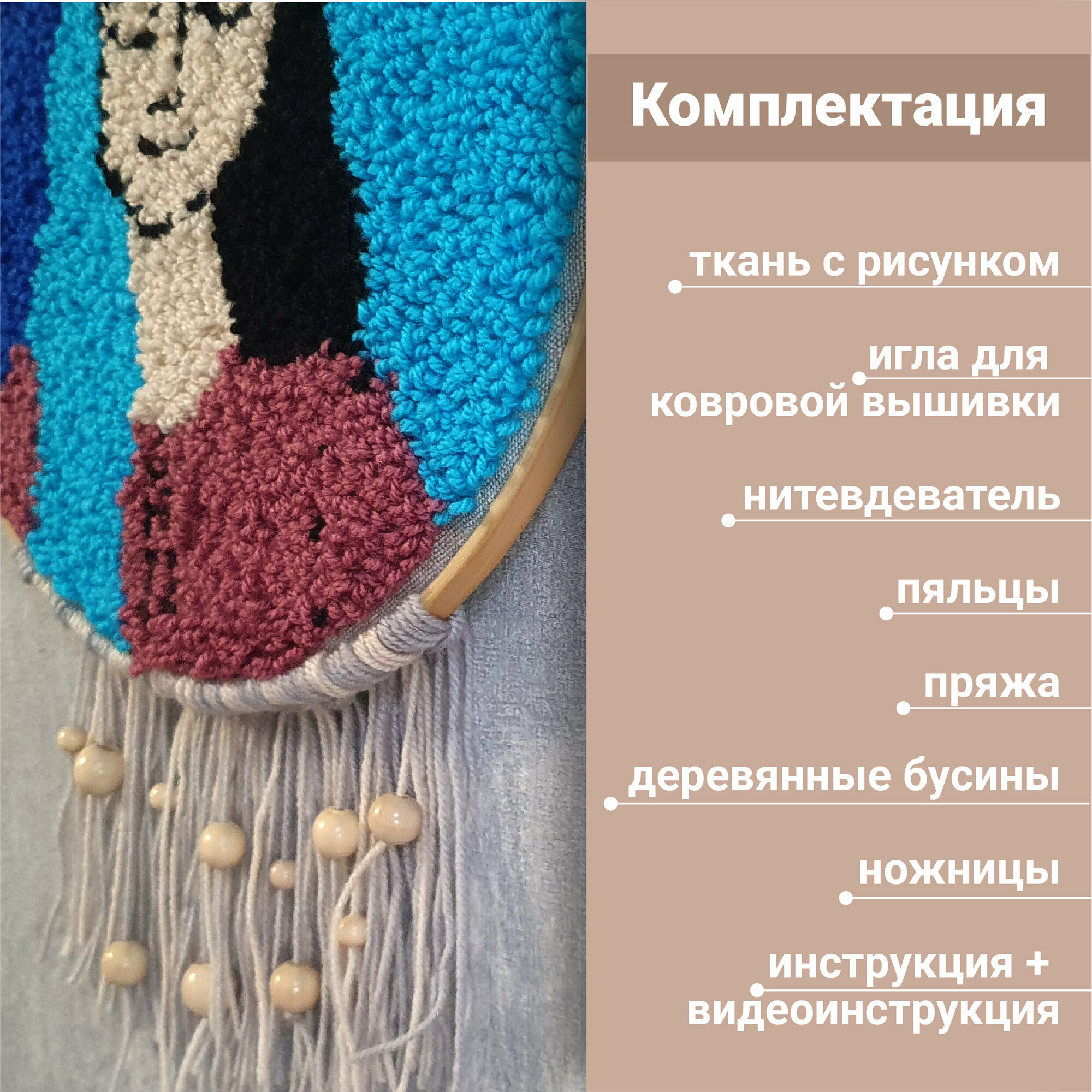 | Комплектация | Что включает в себя творческий набор: ткань с нанесенным рисунком, игла для вышивания с нитевдевателем, пяльцы диаметром 23 см, ножницы, пряжа акриловая всех необходимых цветов, деревянные бусины, хлопковая пряжа для элементов макраме, инструкция и ссылка на видеоинструкцию. |