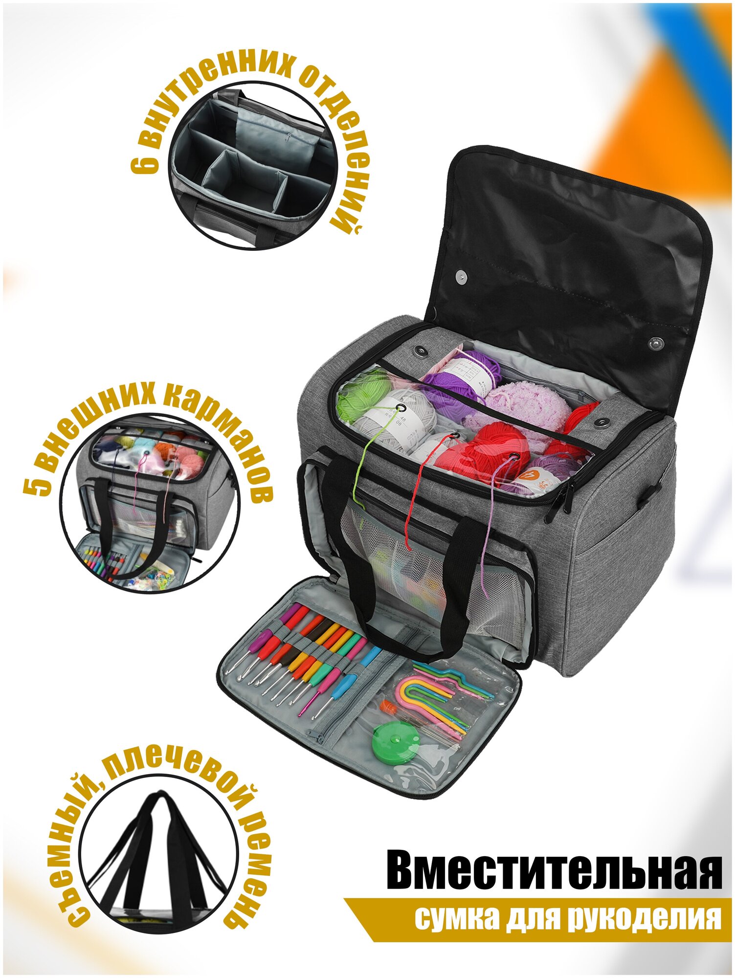Отзывы на Органайзер для вязания, органайзер для рукоделия, проектная сумка Bina, серая, размер 38Хх26х25 см.