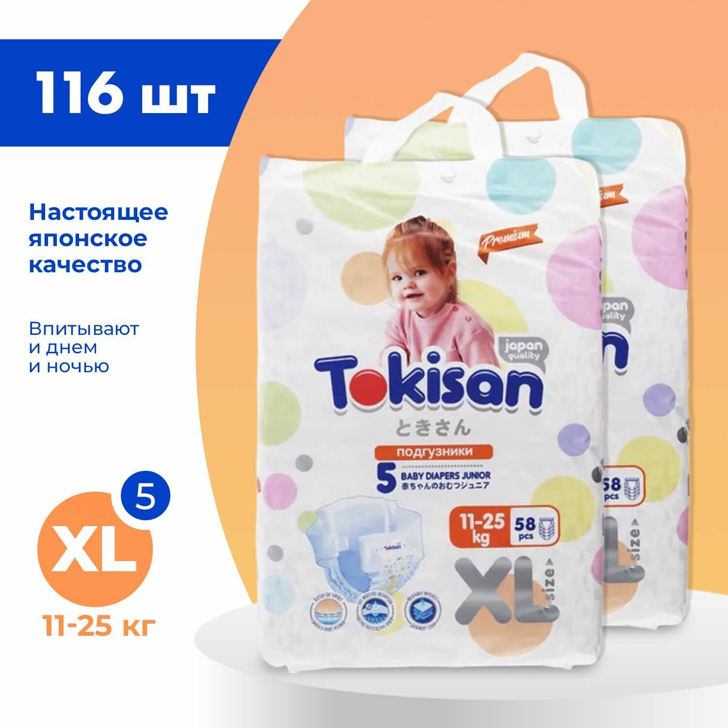 Подгузники детские Tokisan Premium JUNIOR XL для малышей 11-25 кг, 5 размер, 116 шт, дневные (ночные) с индикатором, одноразовые дышащие для детей, девочек и мальчиков / набор (2 уп по 58 шт) информация: