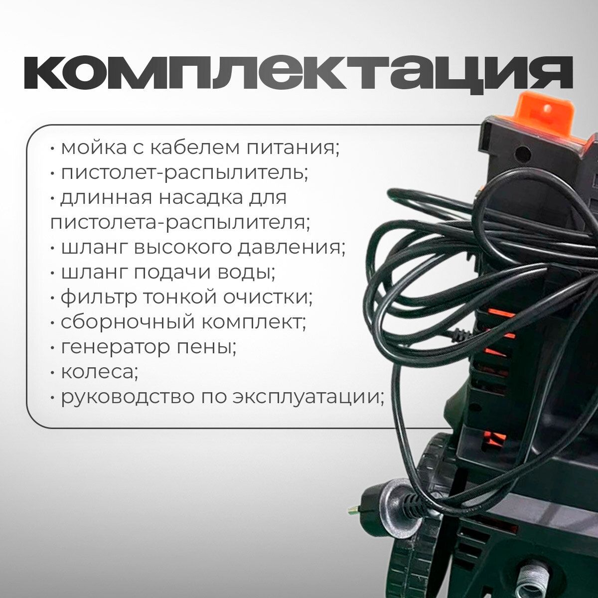 | Подробная комплектация | Мойка с кабелем питания; Пистолет-распылитель; Длинная насадка для пистолета-распылителя; Шланг высокого давления; Шланг подачи воды; Фильтр тонкой очистки; Сборочный комплект; Генератор пены (бачок для моющего средства;) Колеса - 2; Руководство по эксплуатации; Упаковка |
