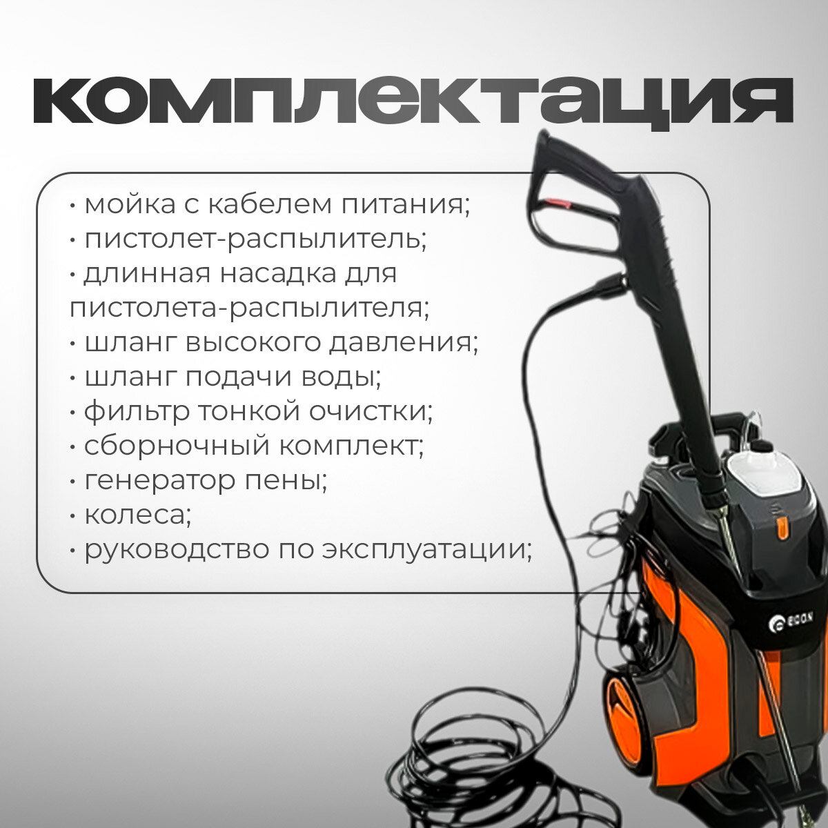 | Подробная комплектация | Мойка с кабелем питания; Пистолет-распылитель; Длинная насадка для пистолета-распылителя; Шланг высокого давления; Шланг подачи воды; Фильтр тонкой очистки; Сборочный комплект; Бачок для моющего средства; Генератор пены; Колеса - 2; Руководство по эксплуатации; Упаковка |