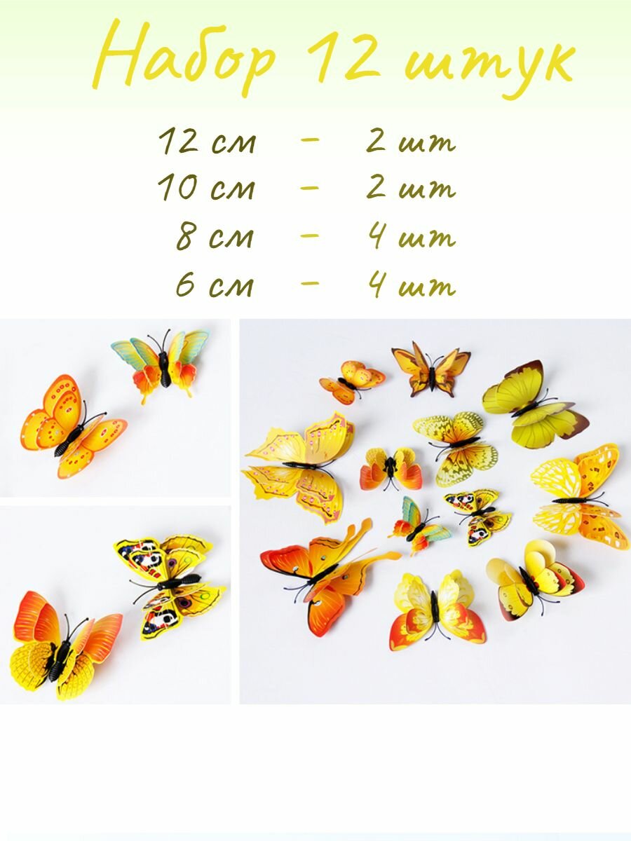 Наклейки интерьерные декоративные бабочки 3d с магнитом на стену для украшения дома, комнат, цветов желтые информация: