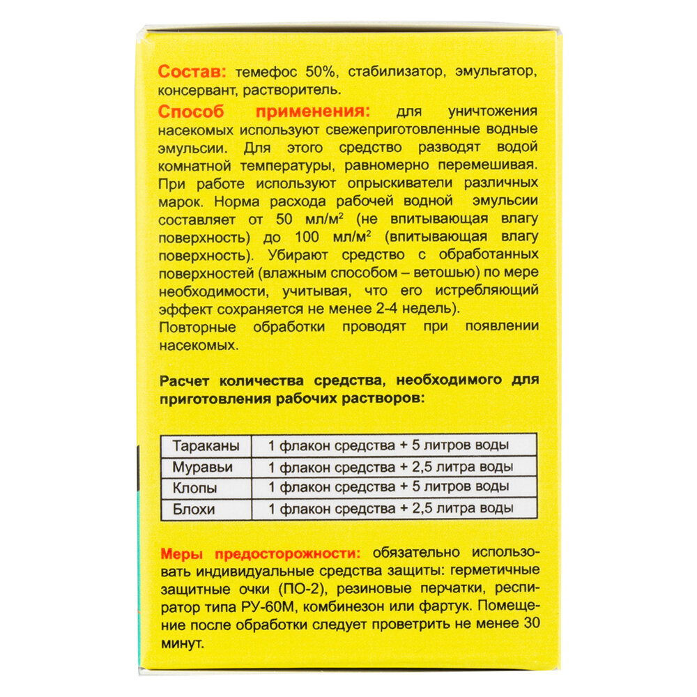 | Способ применения | Средство необходимо развести с водой в пропорциях: клопы, тараканы: 50 мл средства на 5 литров воды; муравьи, блохи: 50 мл средства на 2,5 литра воды; мухи: 50 мл на 5 литров воды. Опрыскать места обитания и передвижения насекомых. Соблюдайте меры предосторожности. |