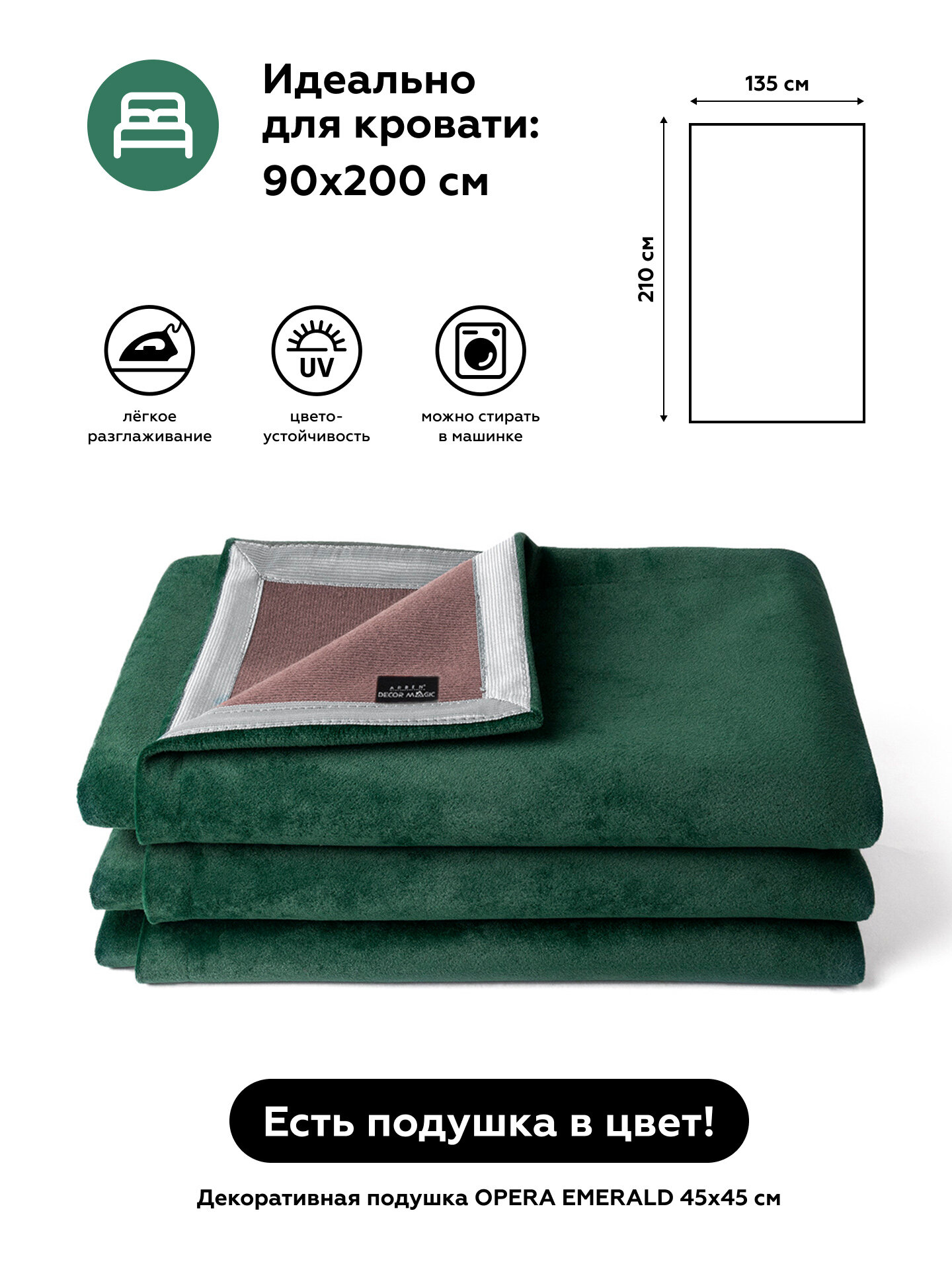 Покрывало 135x210 см UNO OPERA EMERALD на кровать, велюр информация: