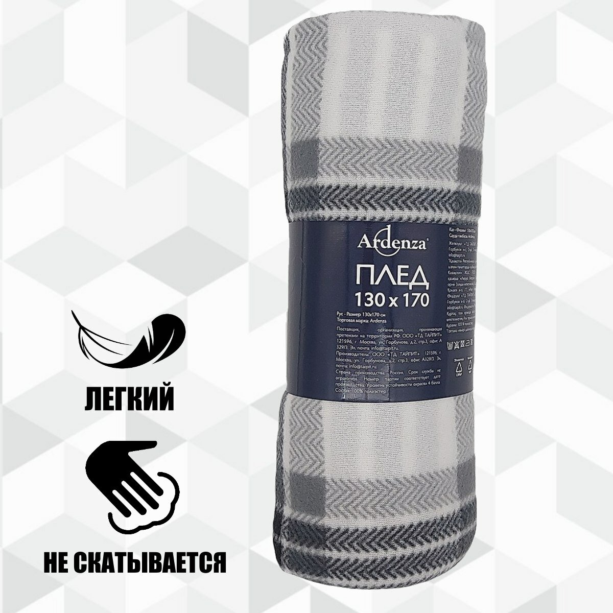 Плед 1.5-спальный 130х170, флис, черно-белый, клетка, на природу 3шт информация:
