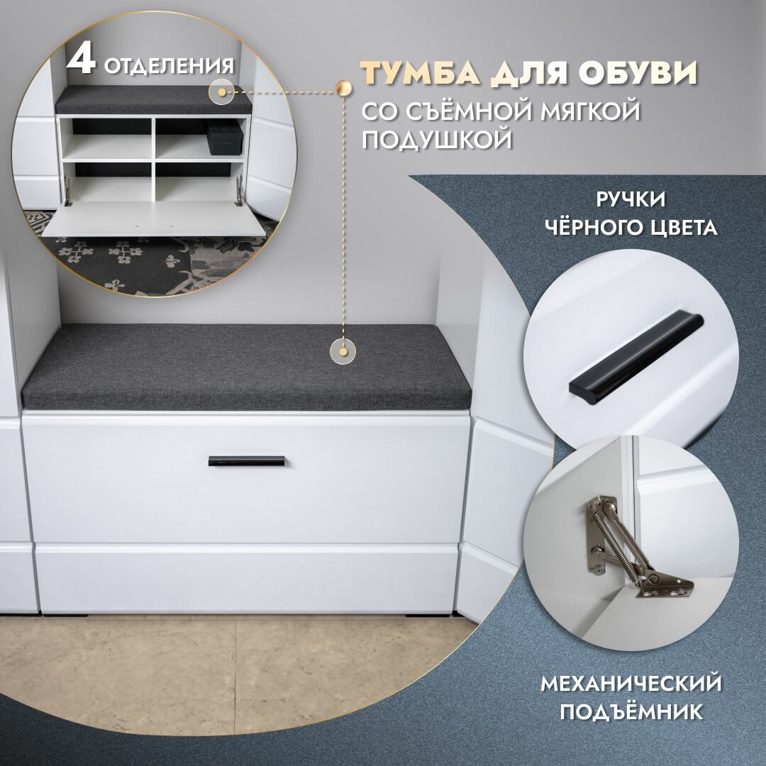 | Особенности | глянцевые фасады, для маленькой прихожей, для узкой прихожей, крепление к стене, модульная конструкция, мягкое сиденье, с местом для сидения, со штангой для вешалок, угловая конструкция, шкаф без зеркала, шкаф с зеркалом |