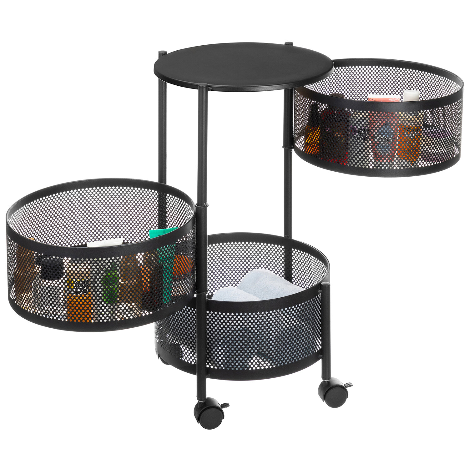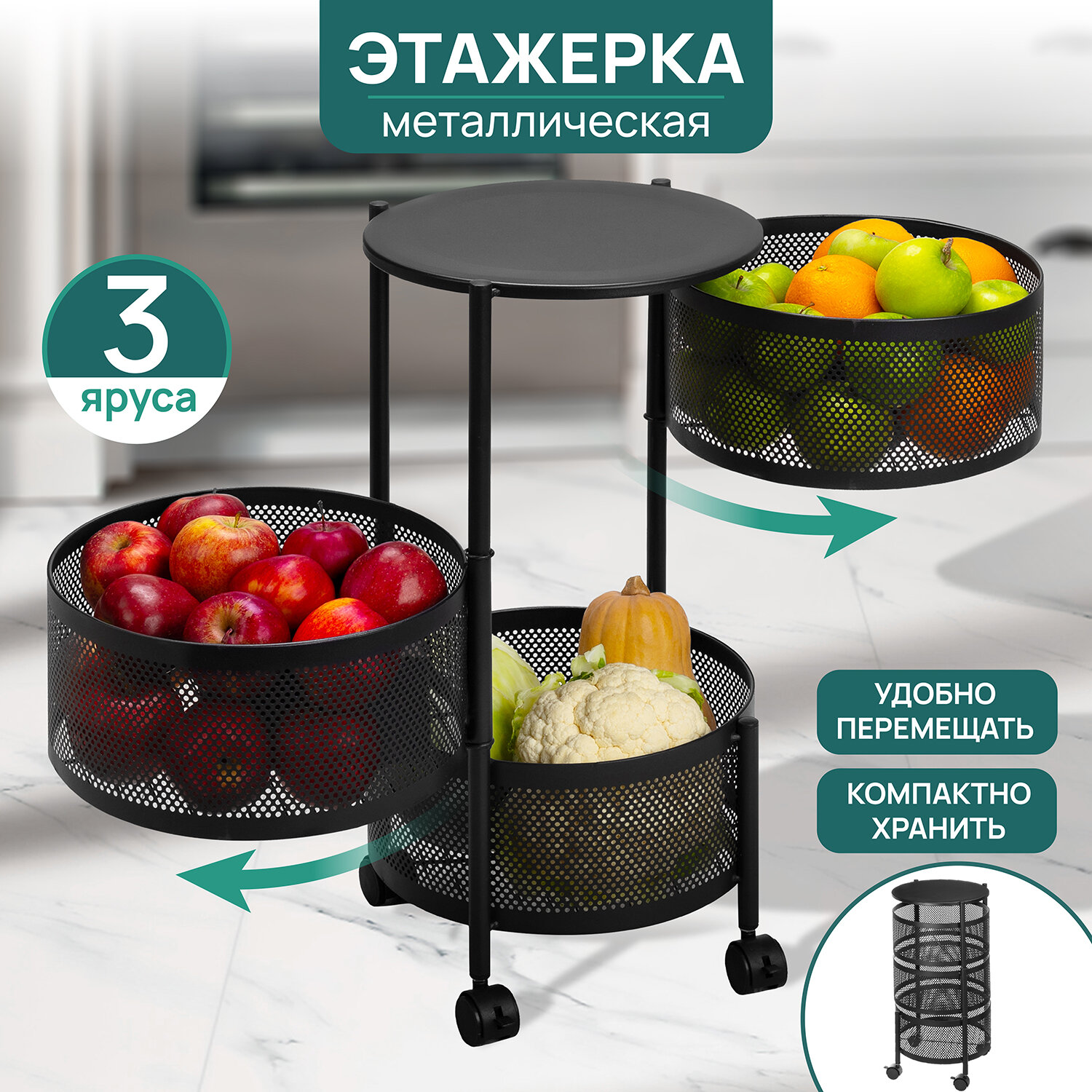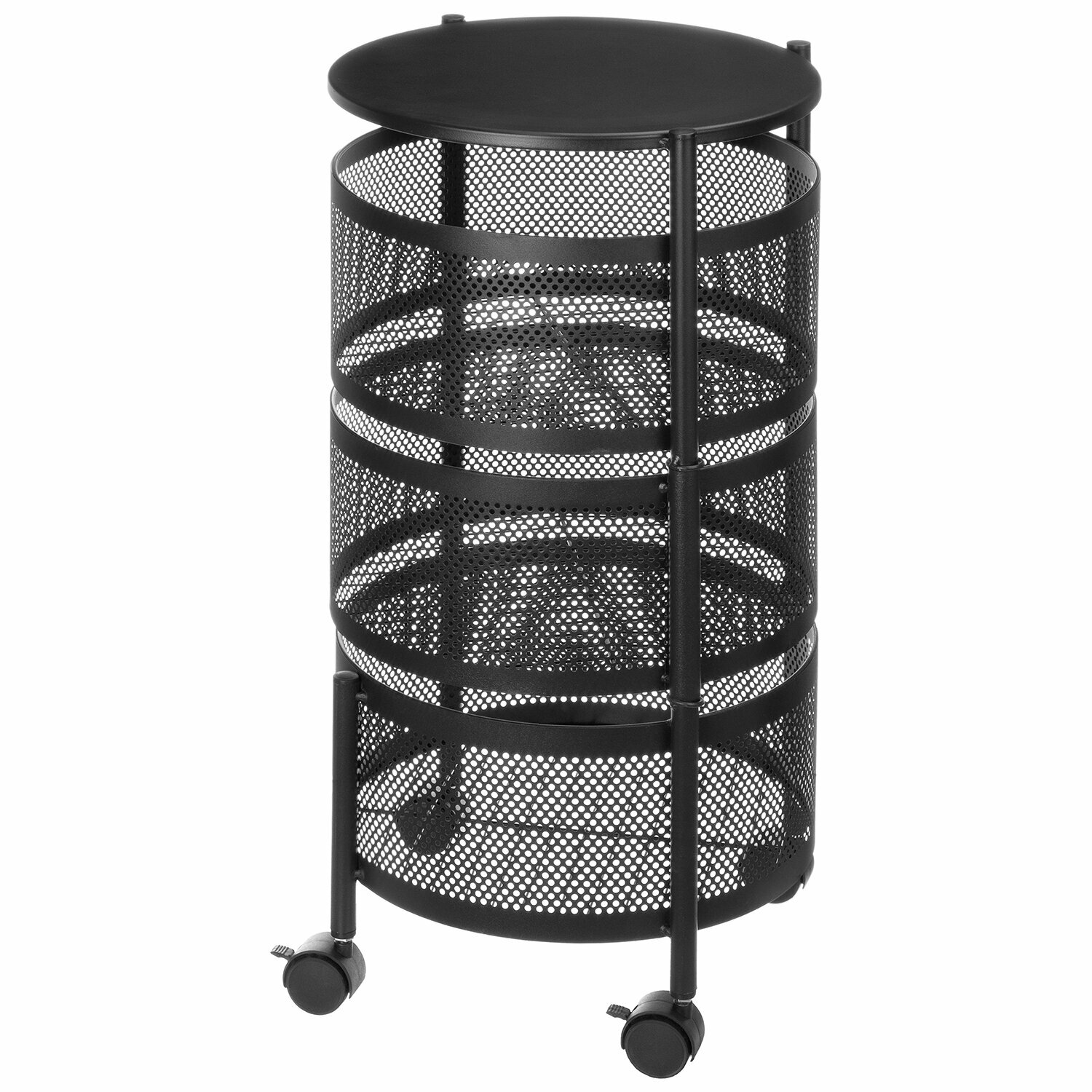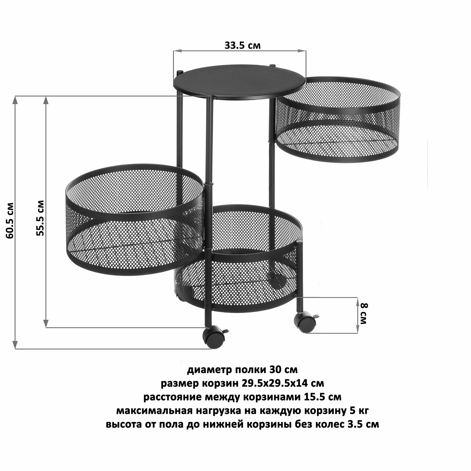 | Дополнительная информация | Этажерка 3-х ярусная на колесиках "Черная" 33,5х32х60,5 см, размер этажерки без колесиков 33,5х32х55,5 см, на 4-х колесиках, 2 колесика с фиксаторами, диаметр полки 30 см, размер корзин 29,5х29,5х14 см, расстояние между корзинами 15,5 см, высота от пола до нижней корзины без колес - 3,5 см, с колесами - 8 см, максимальная нагрузка на каждую корзину 5 кг, металлическая |