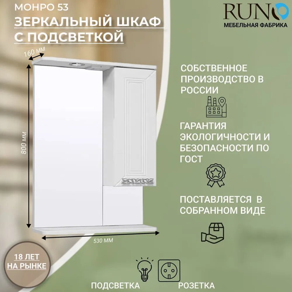 10 цен на Шкаф в ванную с зеркалом с подсветкой Монро 53, правый, белый
