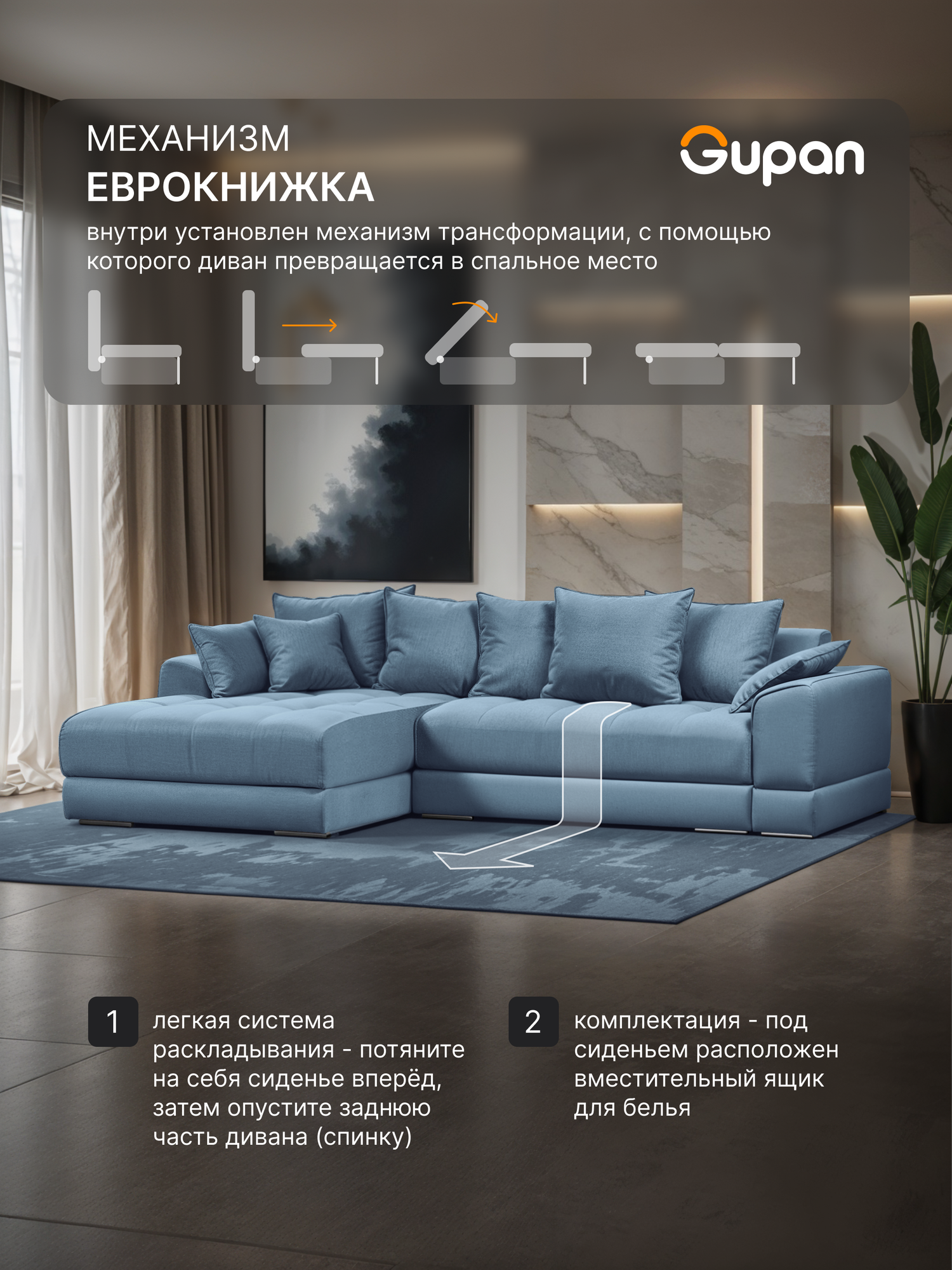 Отзывы на Угловой диван-кровать Gupan Nordkisa, механизм Еврокнижка, 285х190х87 см, наполнитель ППУ, ящик для белья, цвет Amigo Blue