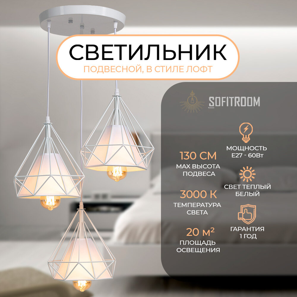 Отзывы на Подвесной светильник Sofitroom Piramid White Лофт 3 светильника, люстра потолочная подвесная, подвесной светильник белый