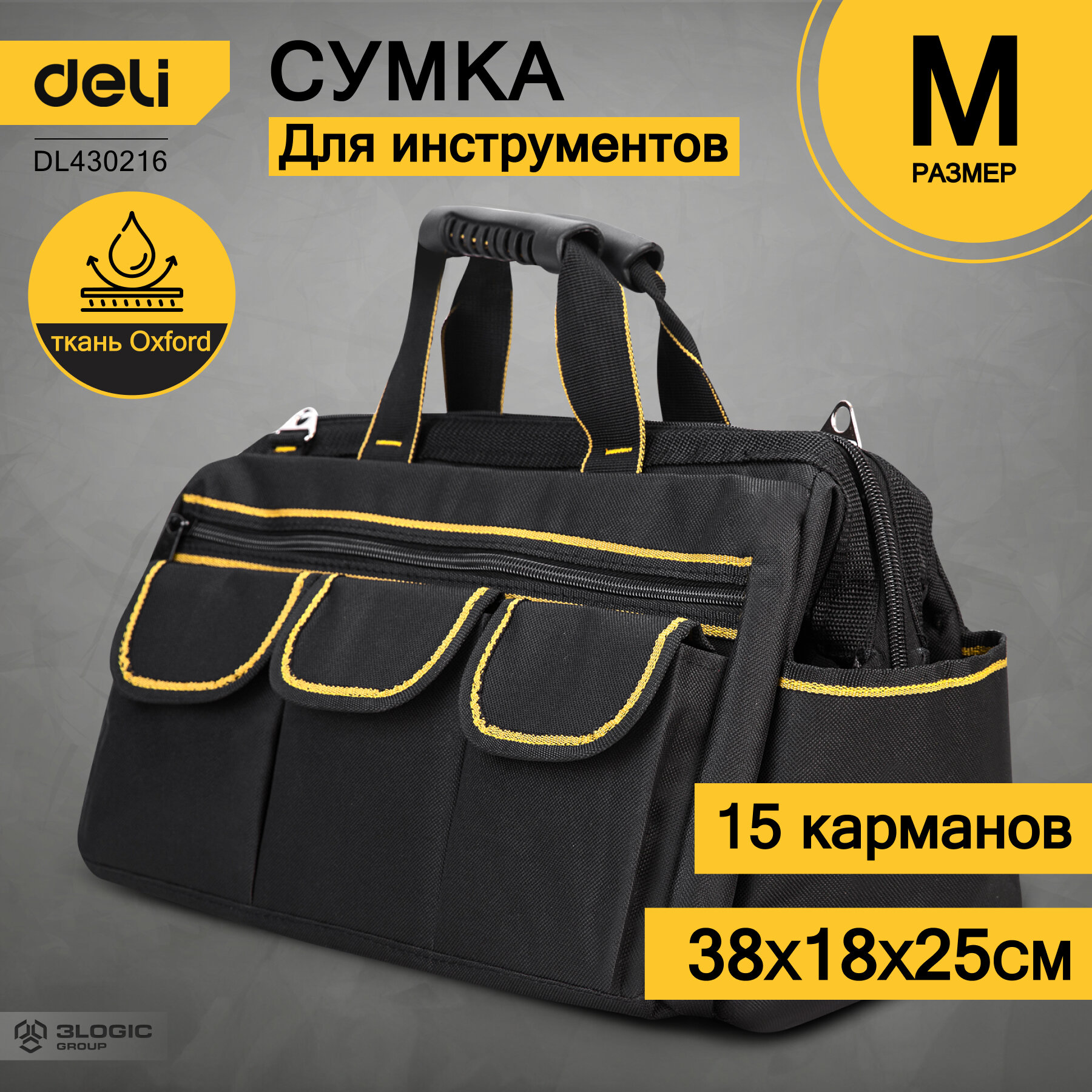10 цен на Сумка для инструментов Deli DL430216 380x180x250мм 15 карманов, водоотталкивающая ткань Oxford, плечевой ремень