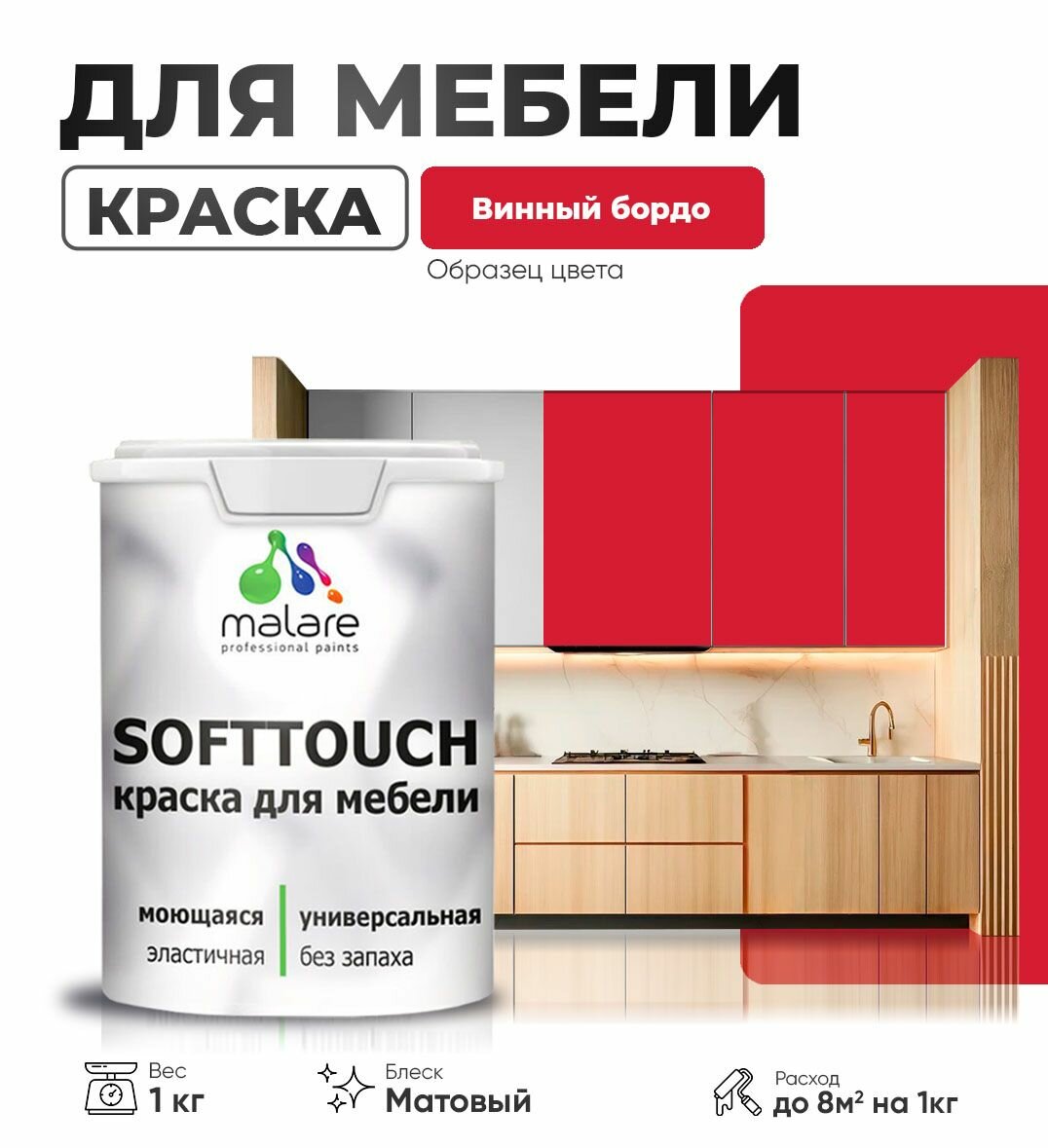 Акриловая краска для мебели Malare SoftTouch для кухонных фасадов для дерева и МДФ, моющаяся быстросохнущая, матовая, винный бордо, 1 кг. информация: