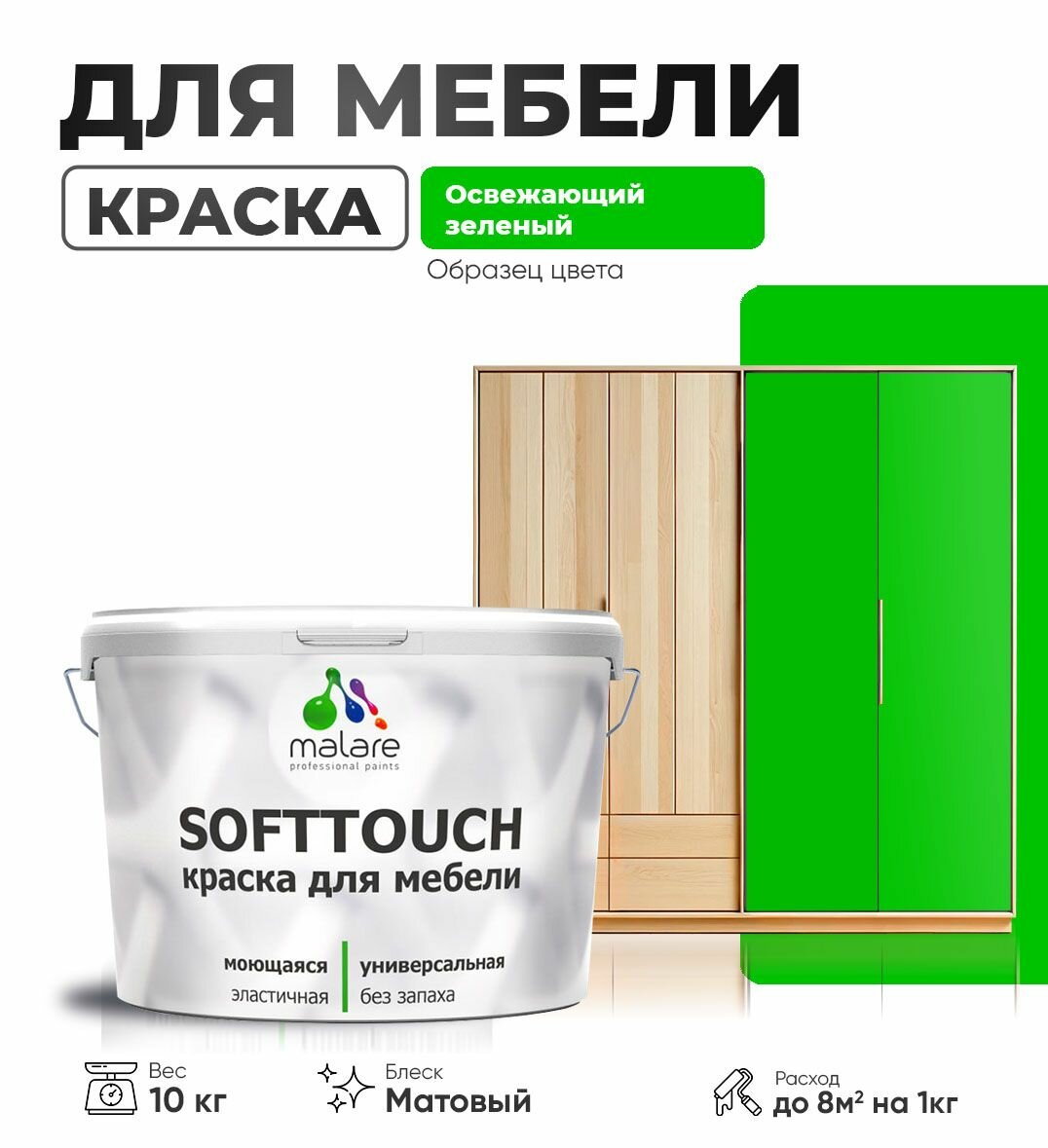 Акриловая краска для мебели Malare SoftTouch для кухонных фасадов для дерева и МДФ, моющаяся быстросохнущая, матовая, освежающий зеленый, 10 кг. информация:
