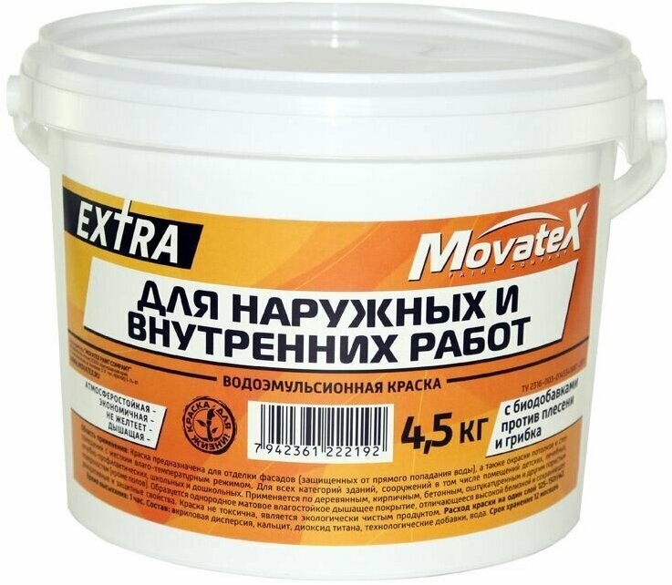 Отзывы на Movatex Краска водоэмульсионная EXTRA для наружных и внутрених работ 4,5 кг Т11865