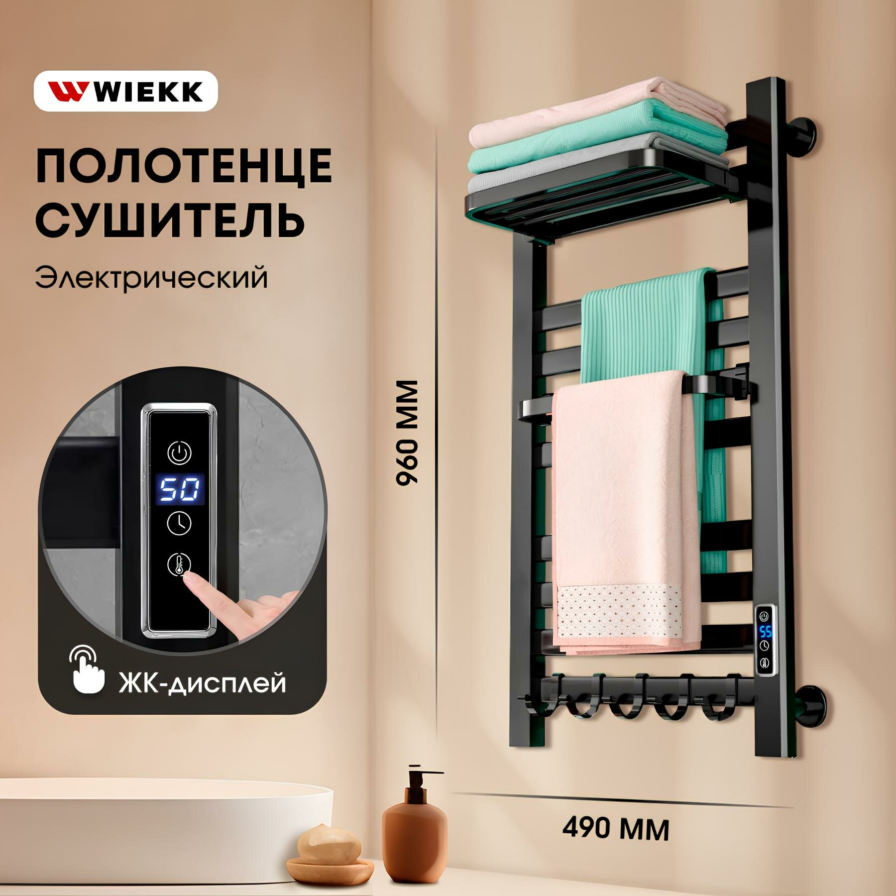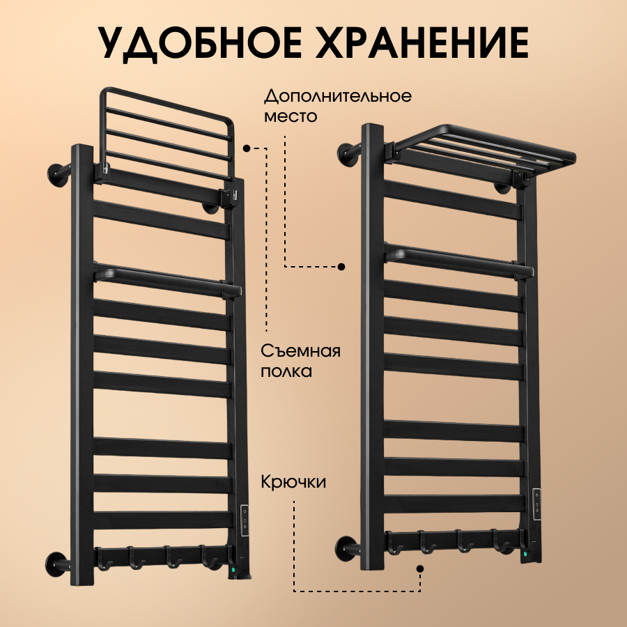 10 цен на Полотенцесушитель Wiekk электрический для ванной большой черный с полочкой, терморегулятором и боковым подключением