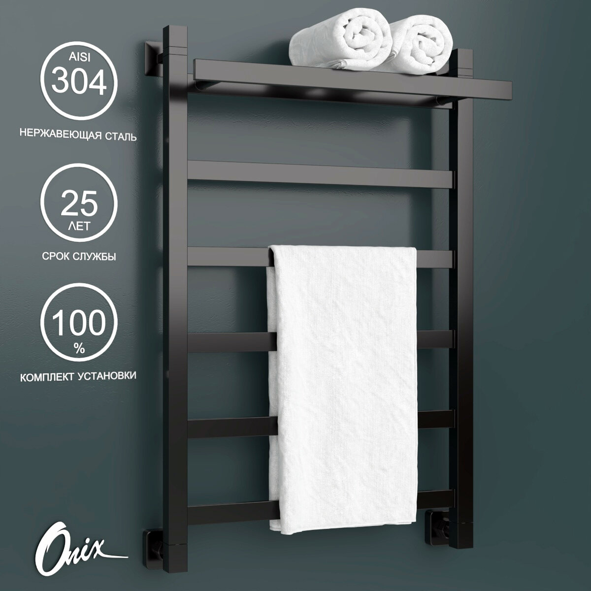 10 цен на Водяной полотенцесушитель Onix, модель Moon Plus Black 500x800, лесенка с полкой с нижним подключением, черный, полный комплект
