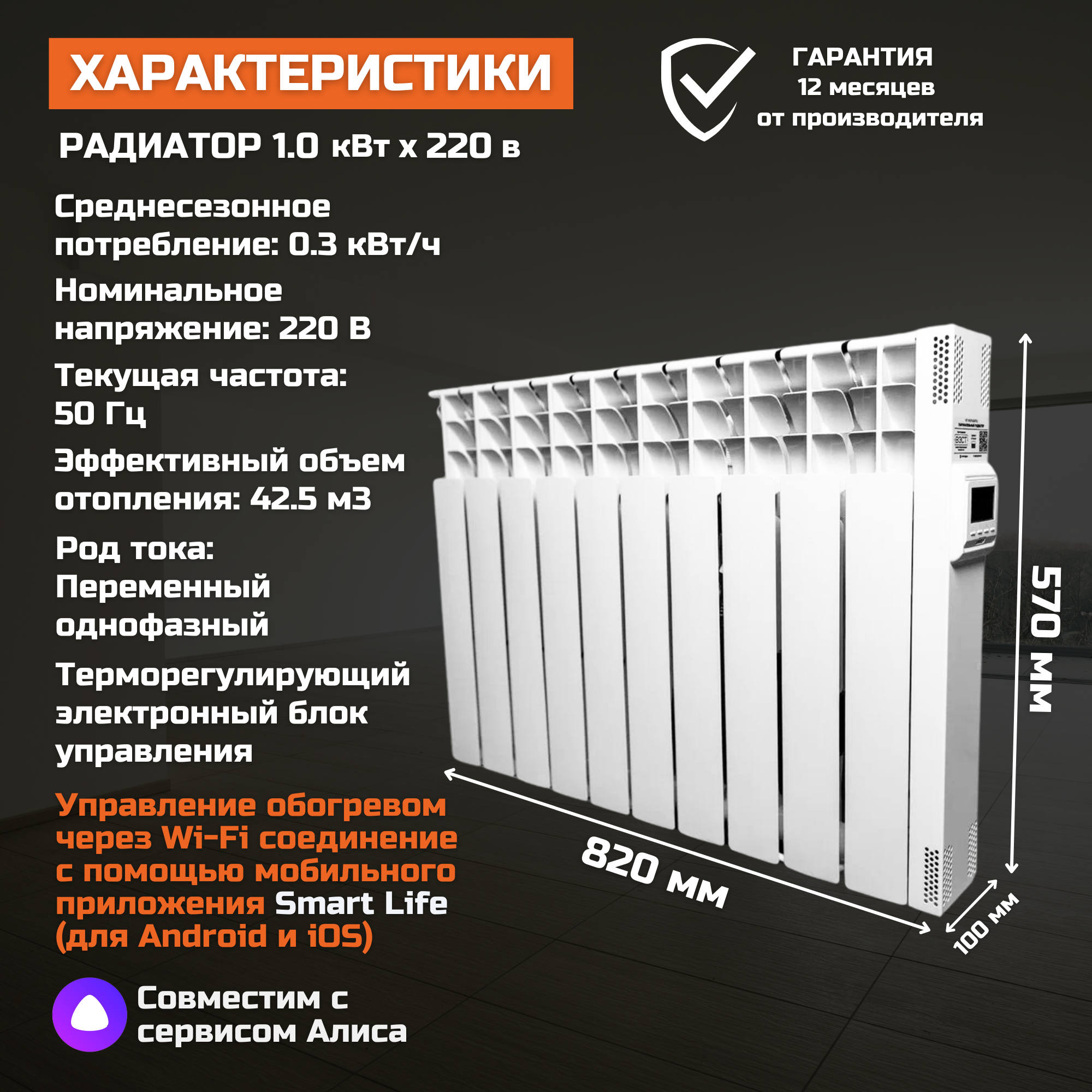 Парокапельный электрический алюминиевый радиатор отопления с Wi-Fi "вэст" / ПКН 1.0х220 / 10 секций информация: