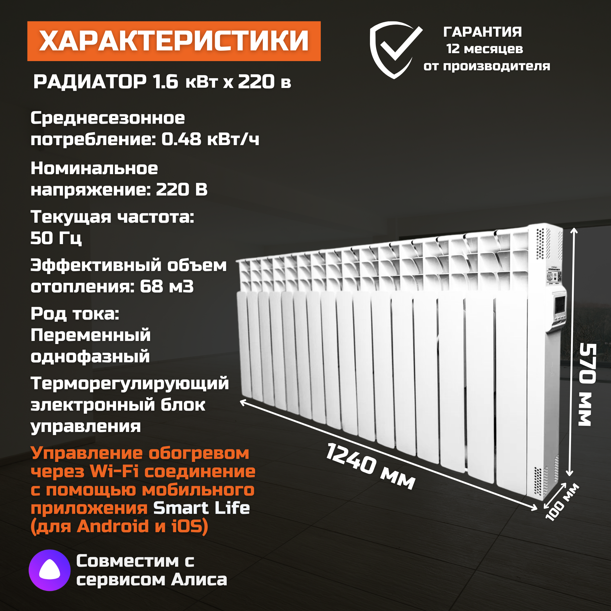 Парокапельный электрический алюминиевый радиатор отопления с Wi-Fi "вэст" / ПКН 1.6х220 / 16 секций информация: