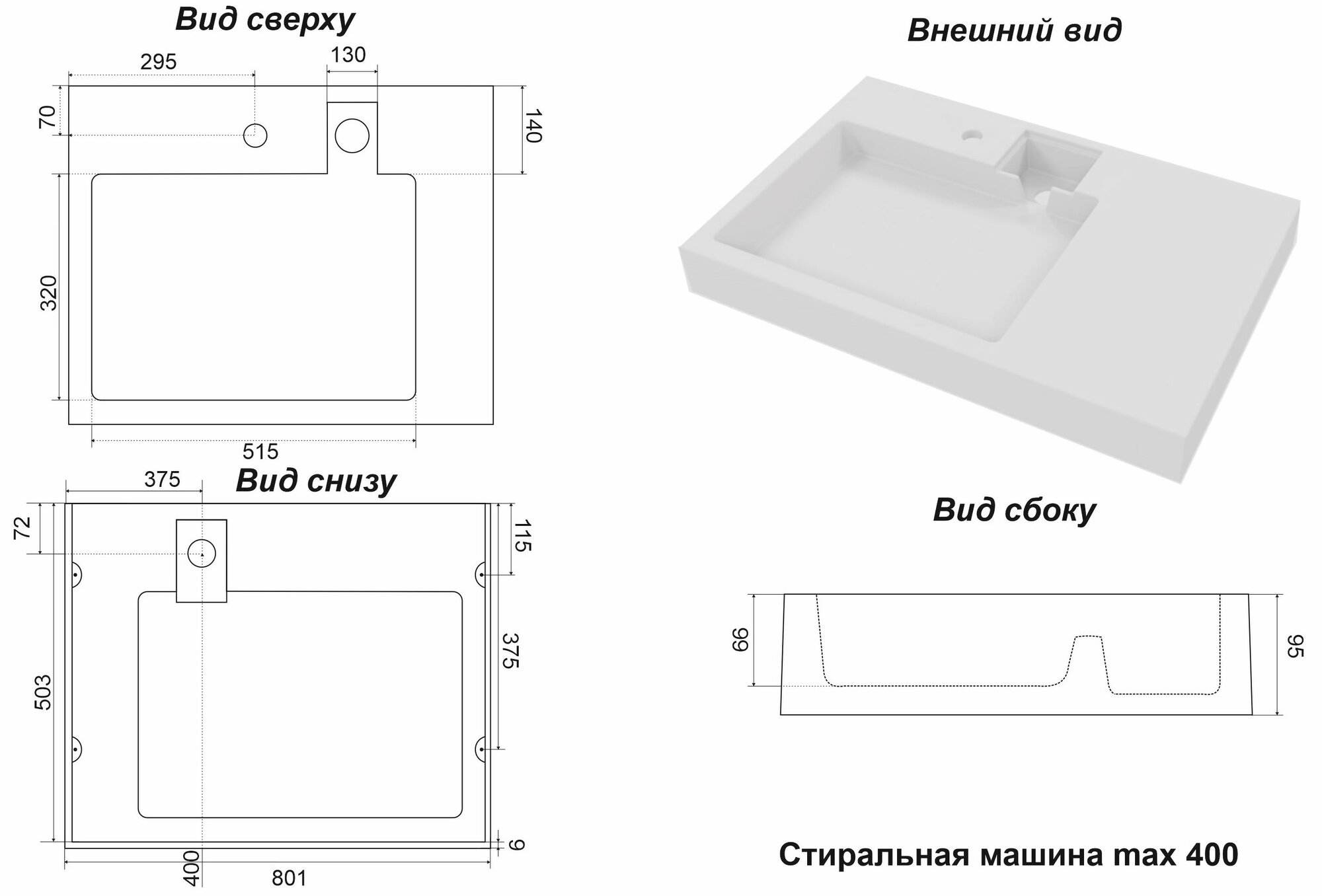 Раковина со столешницей для установки над стиральной машиной Стандарт 80, 800х500, белый информация: