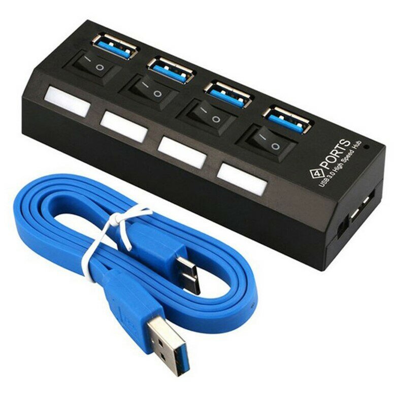 USB - концентратор, разветвитель, хаб GSMIN A47 на 4 порта с выключателем (1А, 5 В, USB 2.0) переходник, адаптер (Черный)