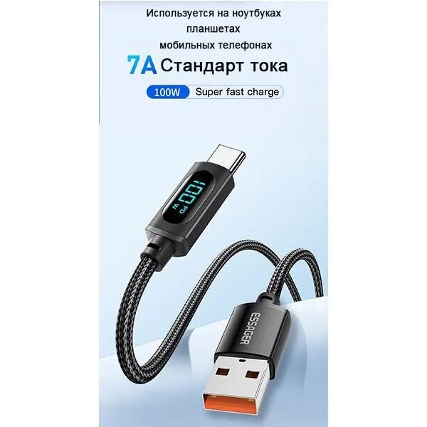 Отзывы на Кабель для быстрой зарядки и передачи данных Essager с измерителем тока (E-mark) USB-Type-C, макс 100 Вт, 7 А, 480 Мбит/с, 1 метр (Черный)