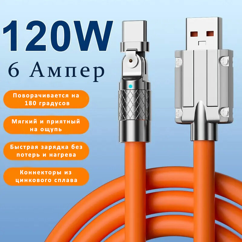 Вращающийся кабель на 180 градусов Type-C для зарядки и передачи данных, 1.5 метра, 6 ампер, 120w, цинк (Оранжевый)