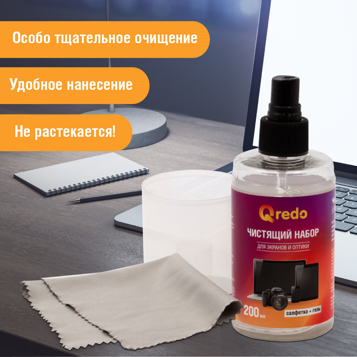 Отзывы на Набор QREDO для чистки экранов и оптики, салфетка из микрофибры + очищающий гель 200 мл