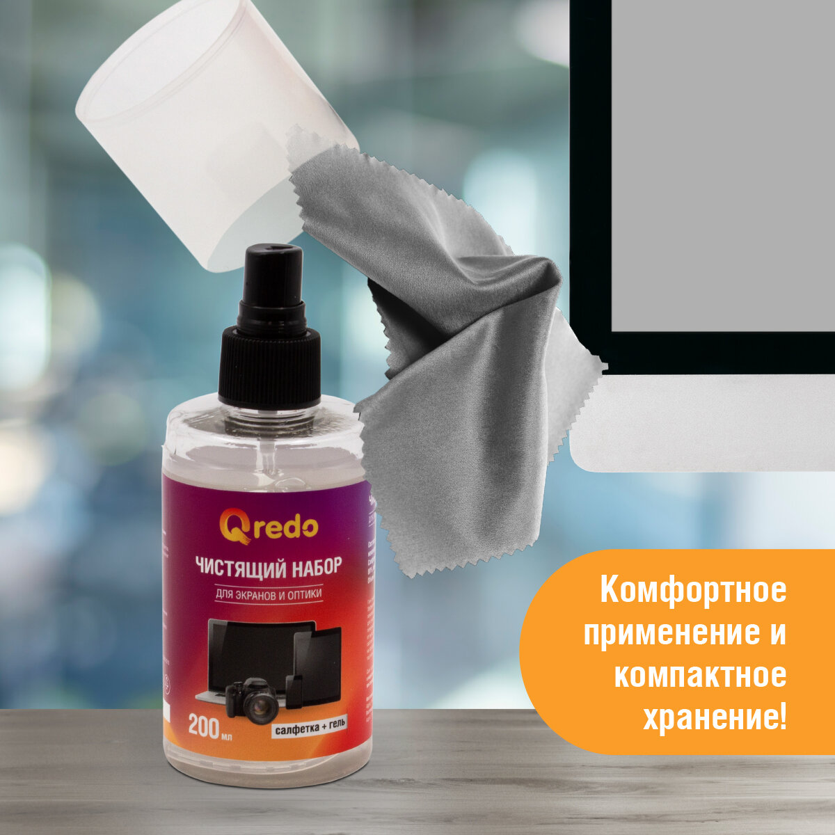Набор QREDO для чистки экранов и оптики, салфетка из микрофибры + очищающий гель 200 мл информация: