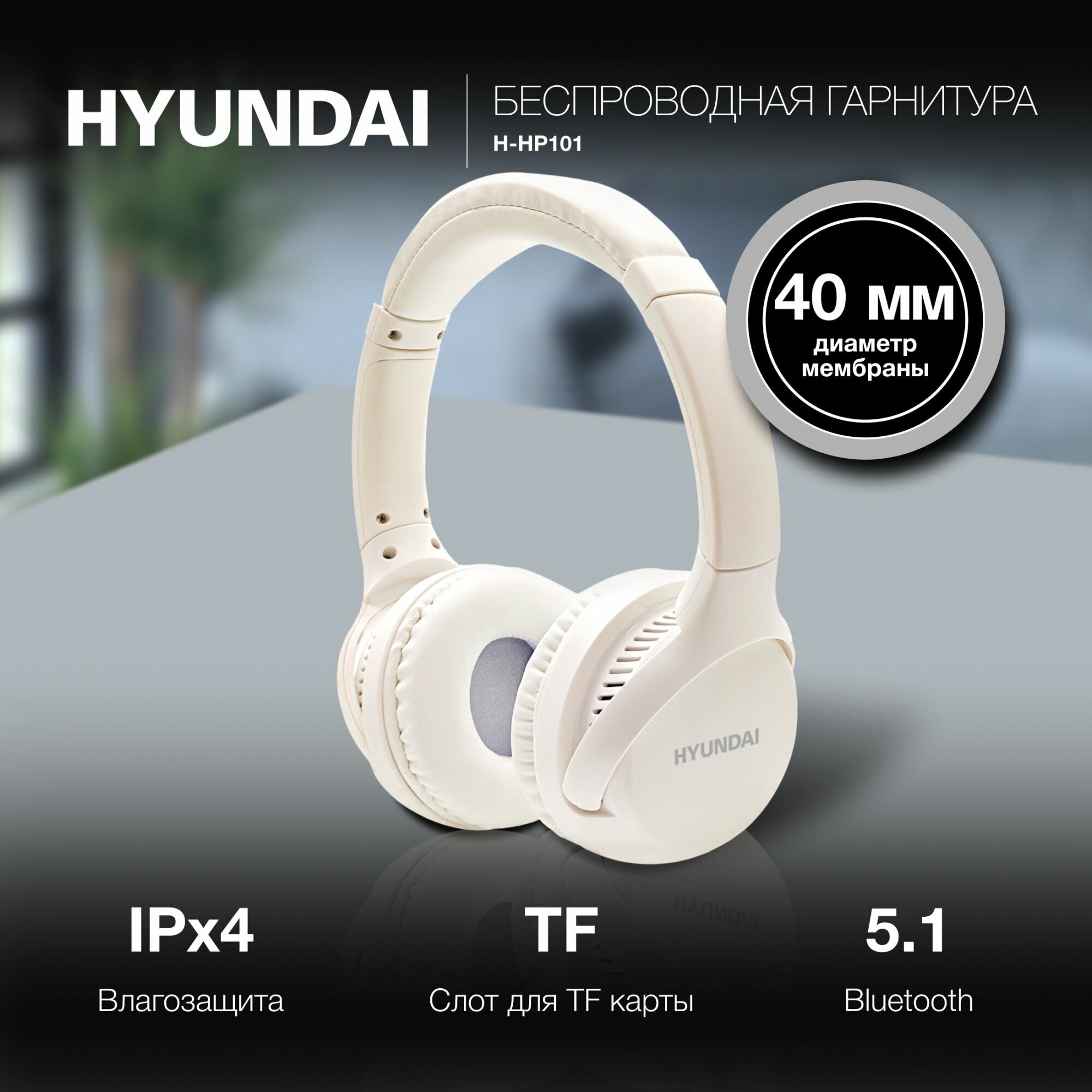 Беспроводные наушники накладные с Bluetooth H-HP101 Hyundai, белый / Bluetooth наушники / Наушники с микрофоном, складные наушники, гарнитура, водонепронецаемые информация: