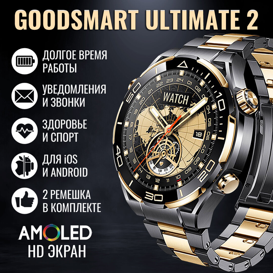 Смарт часы мужские GoodSmart Ultimate 2 чёрно-золотого цвета, AMOLED экран информация: