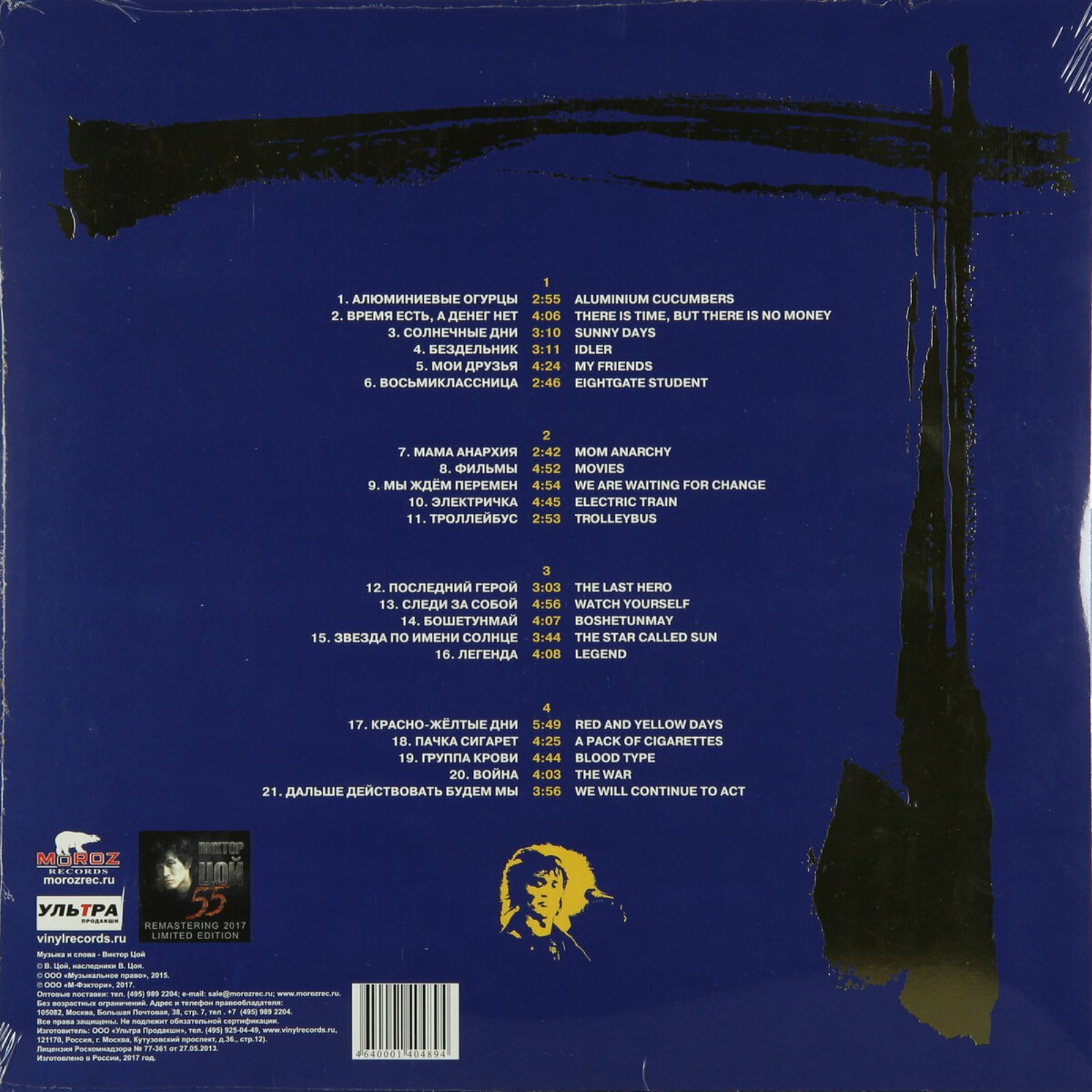 | Треклист | A1. Алюминиевые Огурцы A2. Время Есть, А Денег Нет A3. Солнечные Дни A4. Бездельник A5. Мои Друзья A6. Прогулка романтика B1. Мама Анархия B2. Фильмы B3. Хочу Перемен B4. Электричка B5. Троллейбус C1. Последний Герой C2. Следи За Собой C3. Бошетунмай C4. Звезда По Имени Солнце C5. Легенда D1. Красно-желтые дни D2. Пачка Сигарет D3. Группа Крови D4. Война D5. Дальше действовать будем мы |
