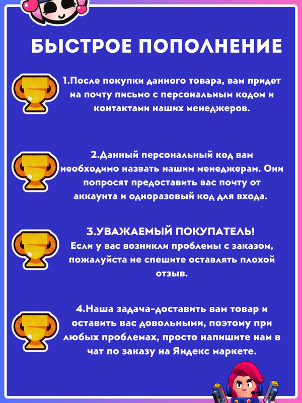 | Инструкция по активации | Для пополнения гемов или другого доната в Brawl Stars нам понадобятся данные для входа в аккаунт. После оплаты заказа, вы получите письмо с персональным кодом и контактами наших менеджеров. Предоставьте менеджеру почту от аккаунта и одноразовый код для входа. Менеджер пополнит ваш аккаунт за 10-20 минут и отправит доказательство о выходе из аккаунта. Если у вас возникли какие-либо трудности с получением письма, то пожалуйста свяжитесь с нами в чате по вашему заказу на Яндекс Маркете, мы обязательно вам поможем! |