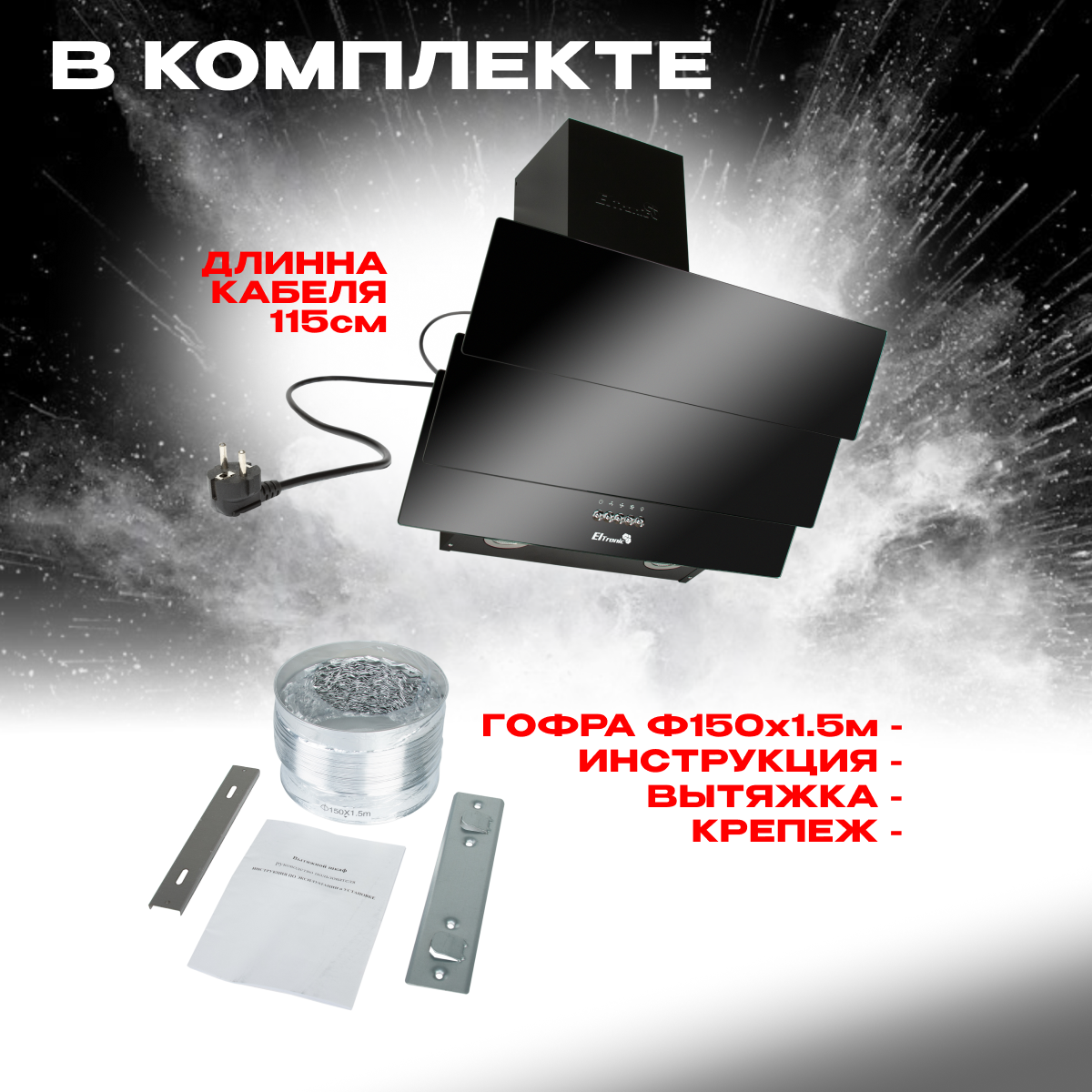 | Дополнительная информация | - Планки для крепления на стену - Инструкция - Гофрированная труба -150 диаметр -1.5м длина |