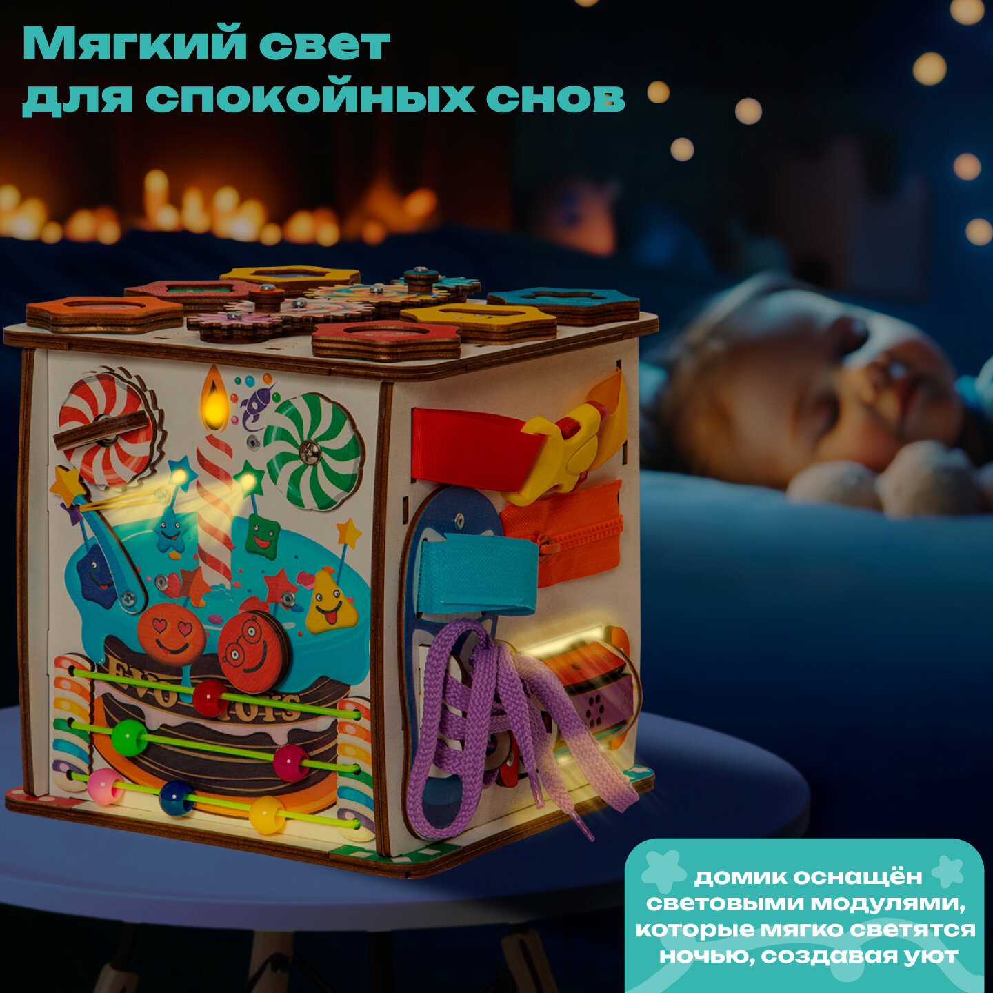Бизиборд кубик развивающий Evotoys Смайлики на дне рождения со светом для малышей информация:
