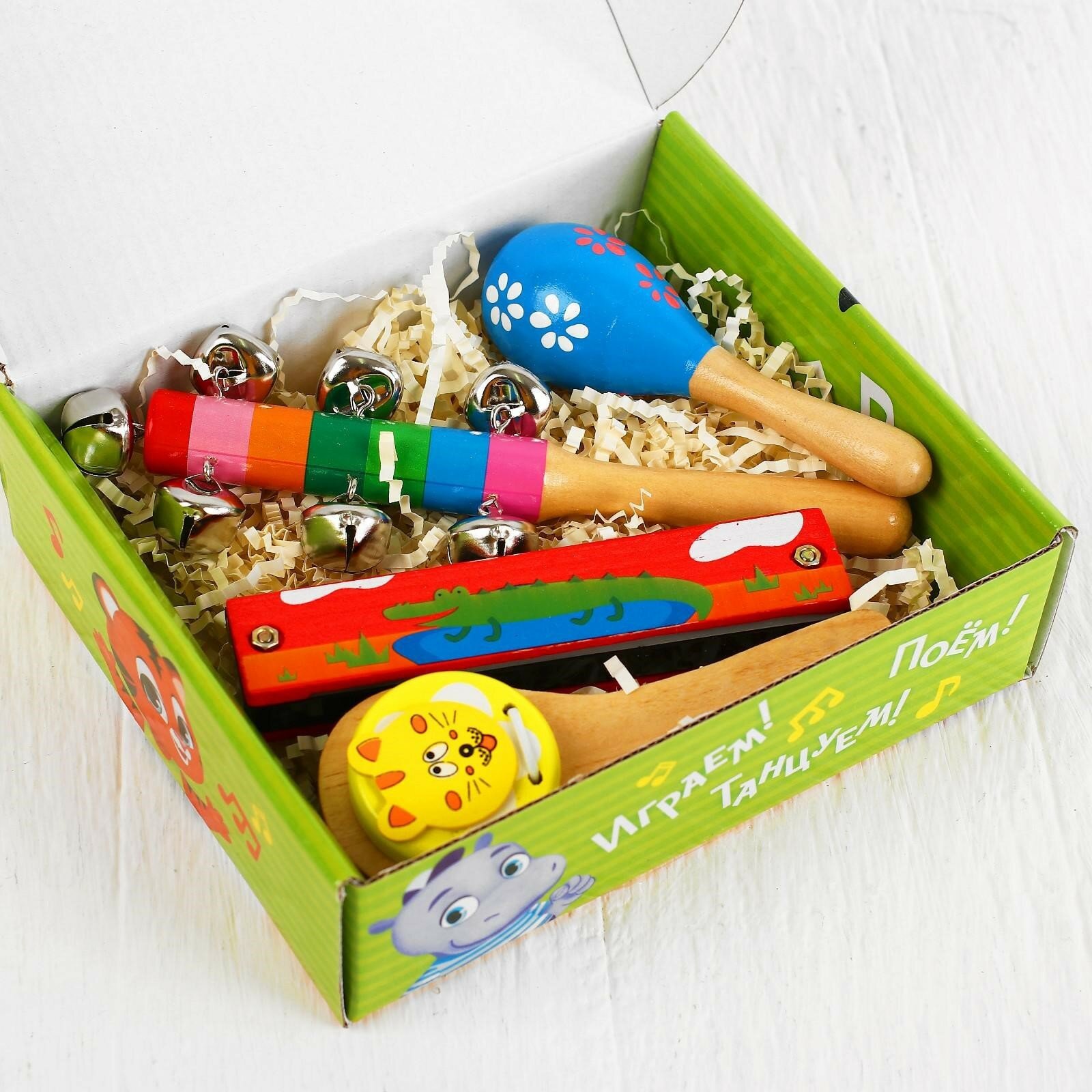 | Комплектация | Колокольчики, маракас, кастаньета, губная гармошка. |
