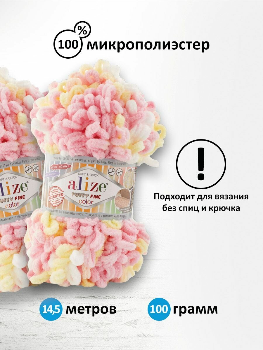 Пряжа Alize Puffy fine color белый-жёлтый-розовый (6367), 100%микрополиэстер, 14.5м, 100г, 5шт