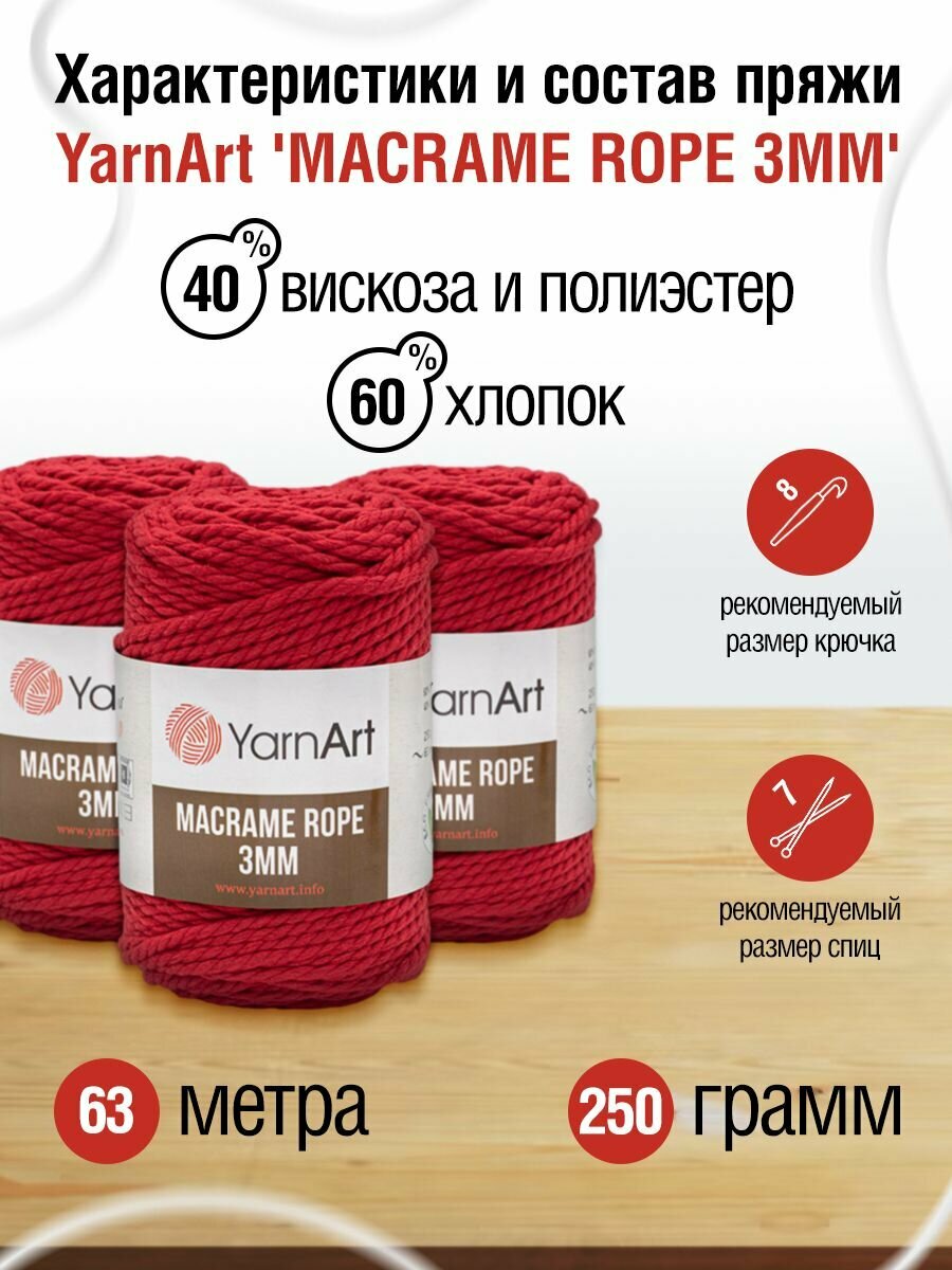 Пряжа для вязания YarnArt 'Macrame Rope 3мм', 250г, 63м (60% хлопок, 40% вискоза и полиэстер) (773 красный), 4 мотка информация: