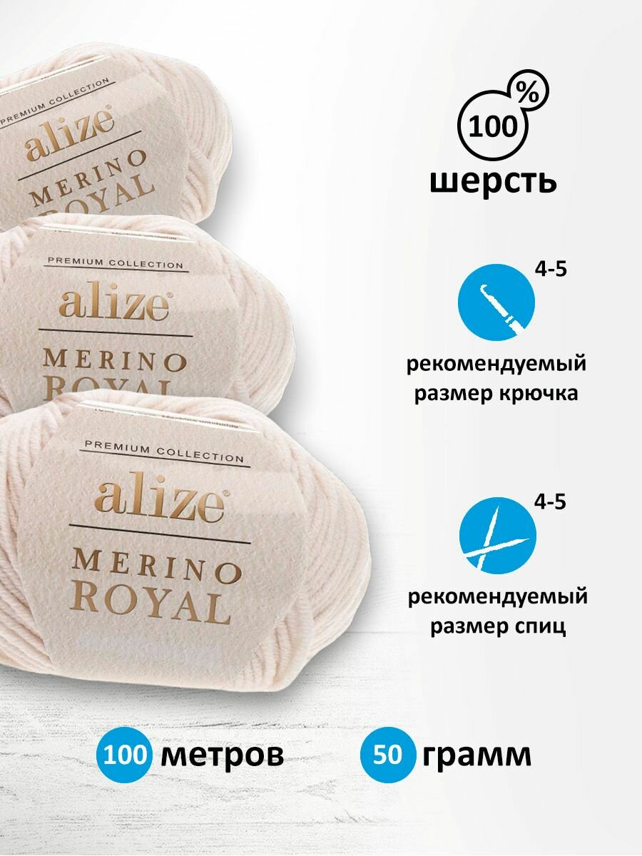 Пряжа для вязания крючком, спицами Alize Ализе Merino royal средняя, шерсть 100%, цвет 67 экрю, 5 шт. по 50 г, 100 м 2 570 ₽