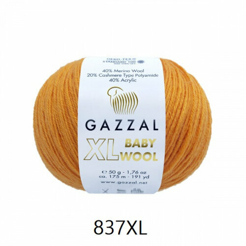Пряжа Gazzal Baby Wool XL оранжевый (837), 40%шерсть мериноса/20%кашемирПА/40%акрил, 100м, 50г, 1шт
