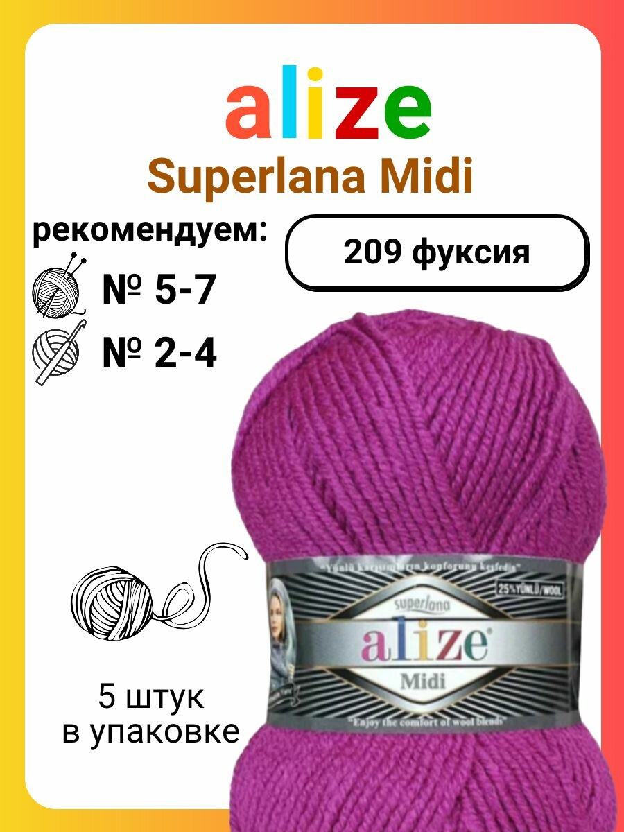 Пряжа Alize Superlana Midi 209 фуксия, 100 г, 170 м, 5 штук информация: