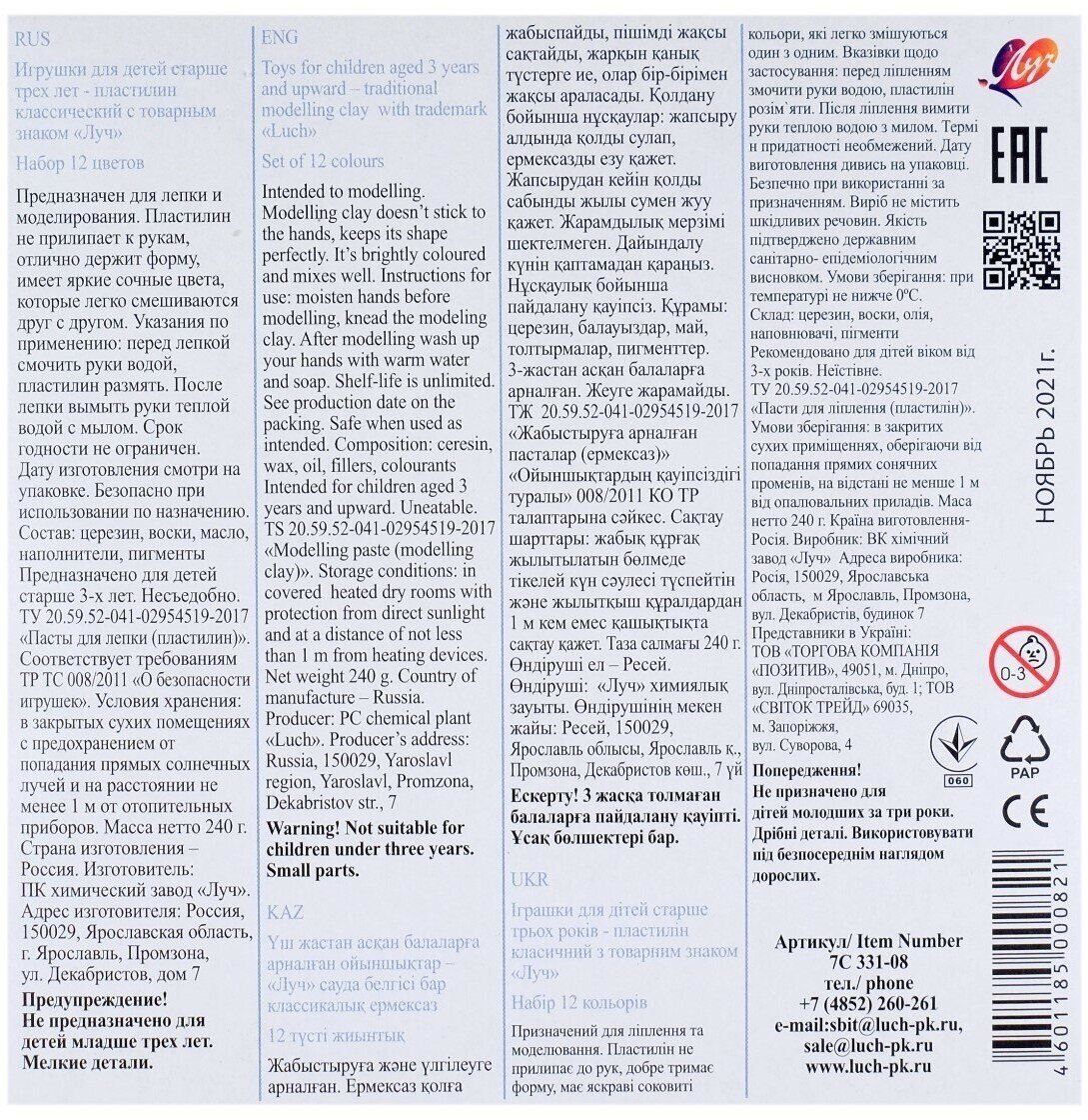 Пластилин классический Луч Классика 12 цв 240 г со стеком информация: