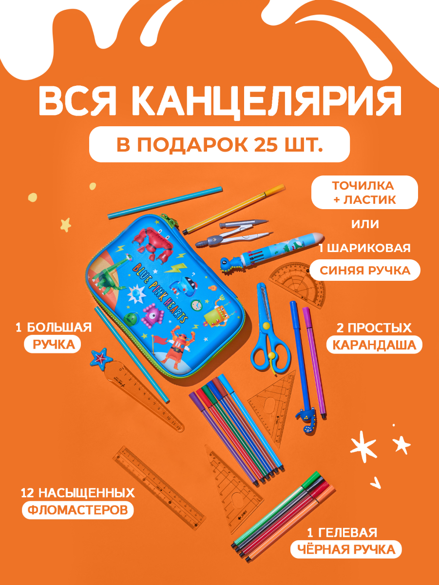 10 цен на Пенал для школы BluePink Hearts с канцелярией, 25 предметов, синий космос
