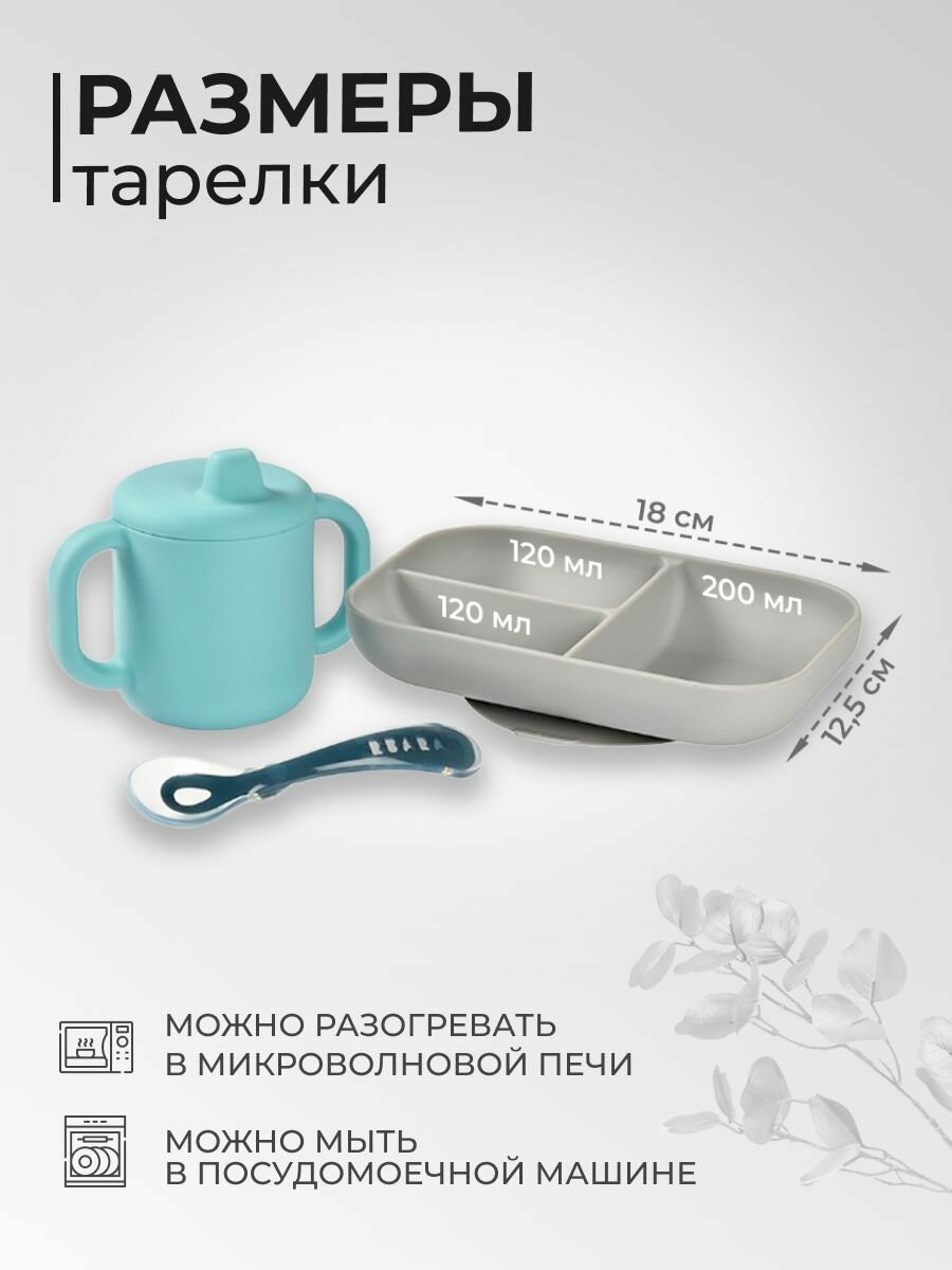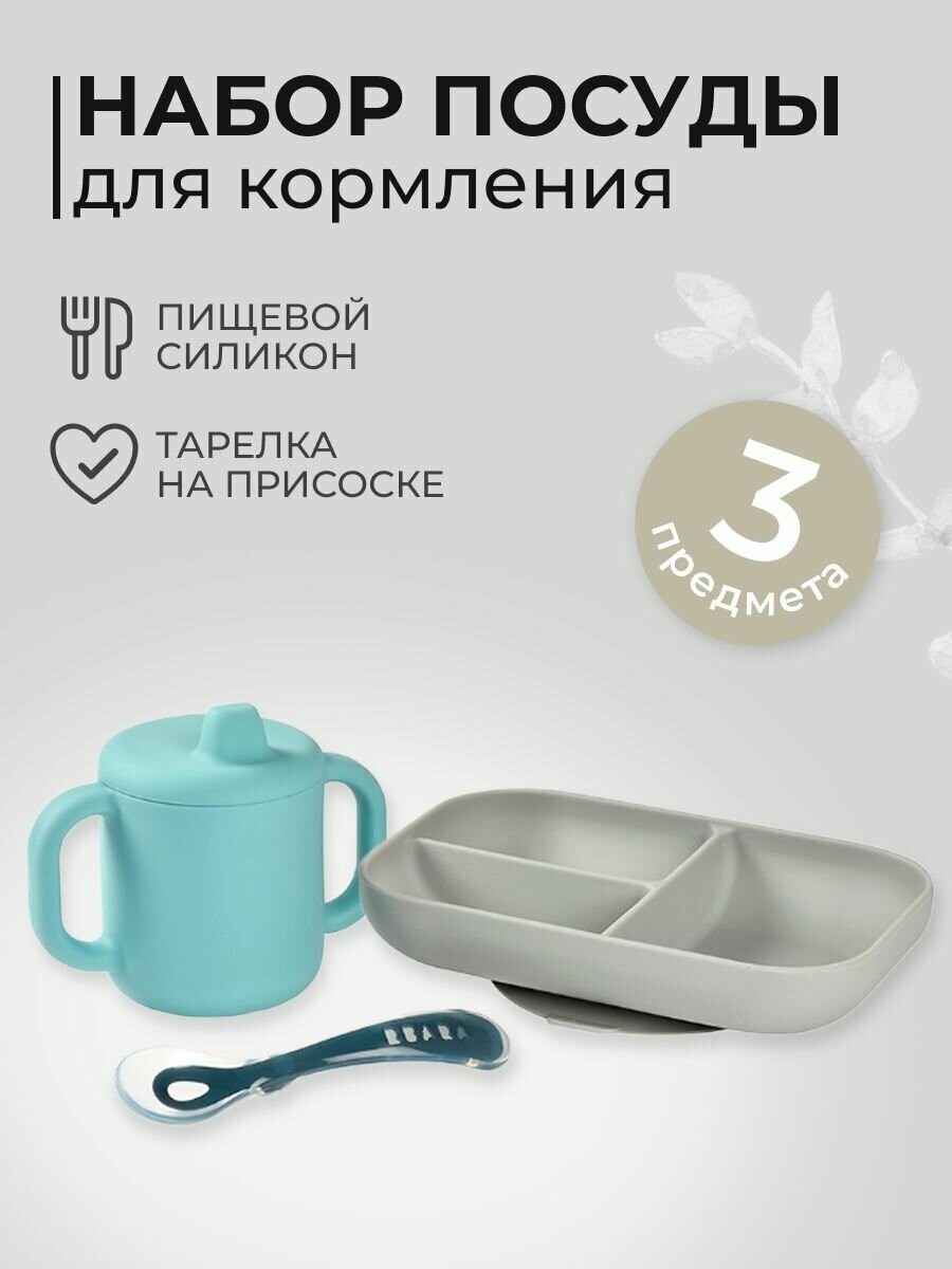 Набор силиконовой детской посуды BEABA: секционная тарелка на присоске, силиконовая кружка с ручками, ложка детская для кормления и прикорма, голубой информация: