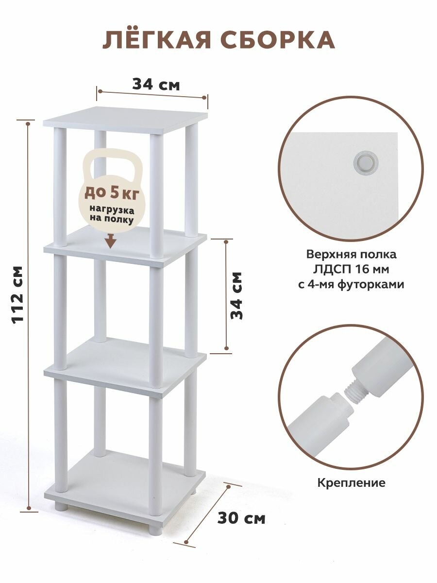 | Дополнительная информация | полка ЛДСП с 4 футорками - 1 шт.; полка ЛДСП с 4 сквозными отверстиями - 3 шт.; стойка пластик - 12 шт.; ножка пластик - 4 шт.; Инструкция по сборке - 1 шт. |