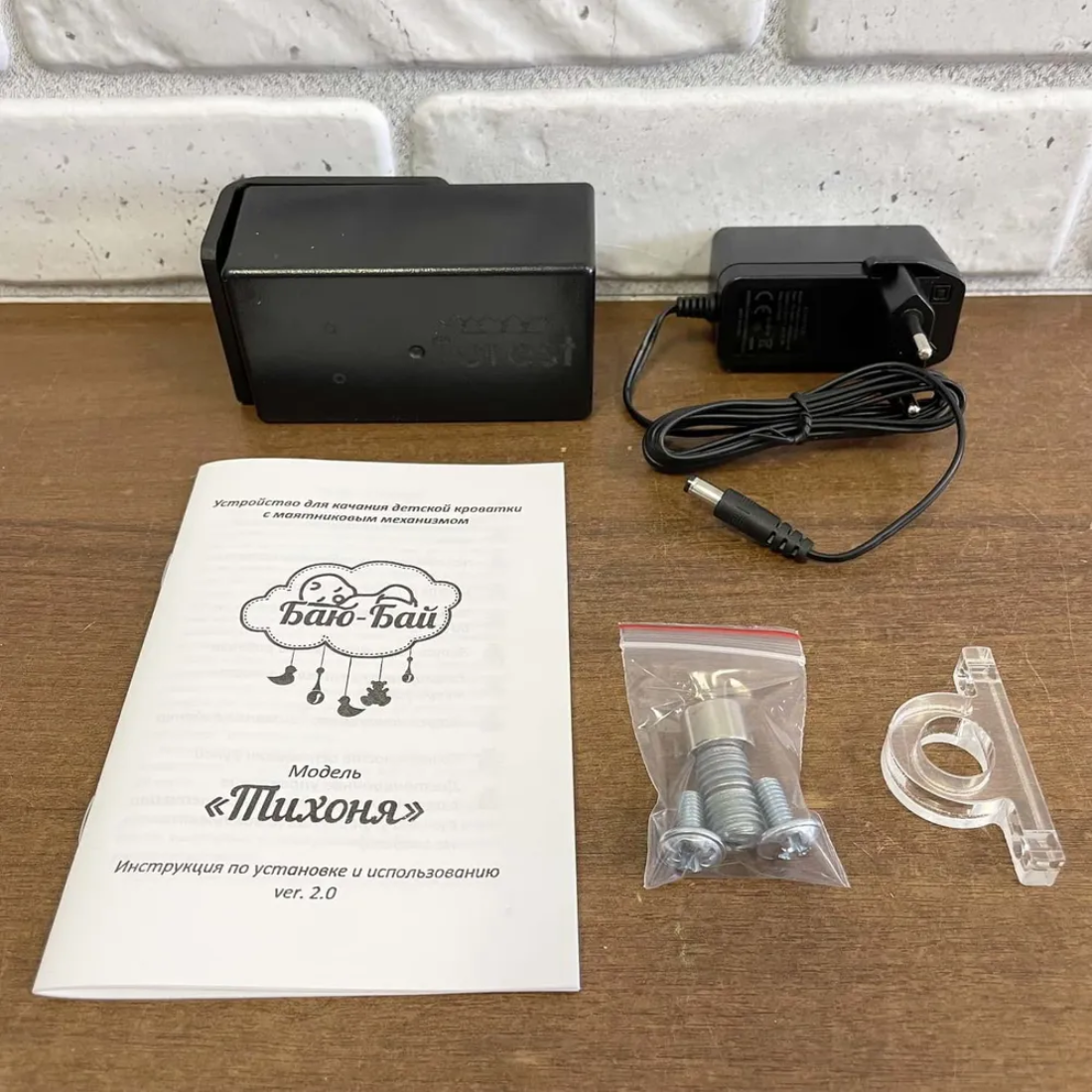 | Комплектация | Приводной блок Баю-Бай Тихоня Bluetooth; Адаптер питания от сети 220 В; Крепежный набор; Инструкция по эксплуатации; Фирменная упаковка. |