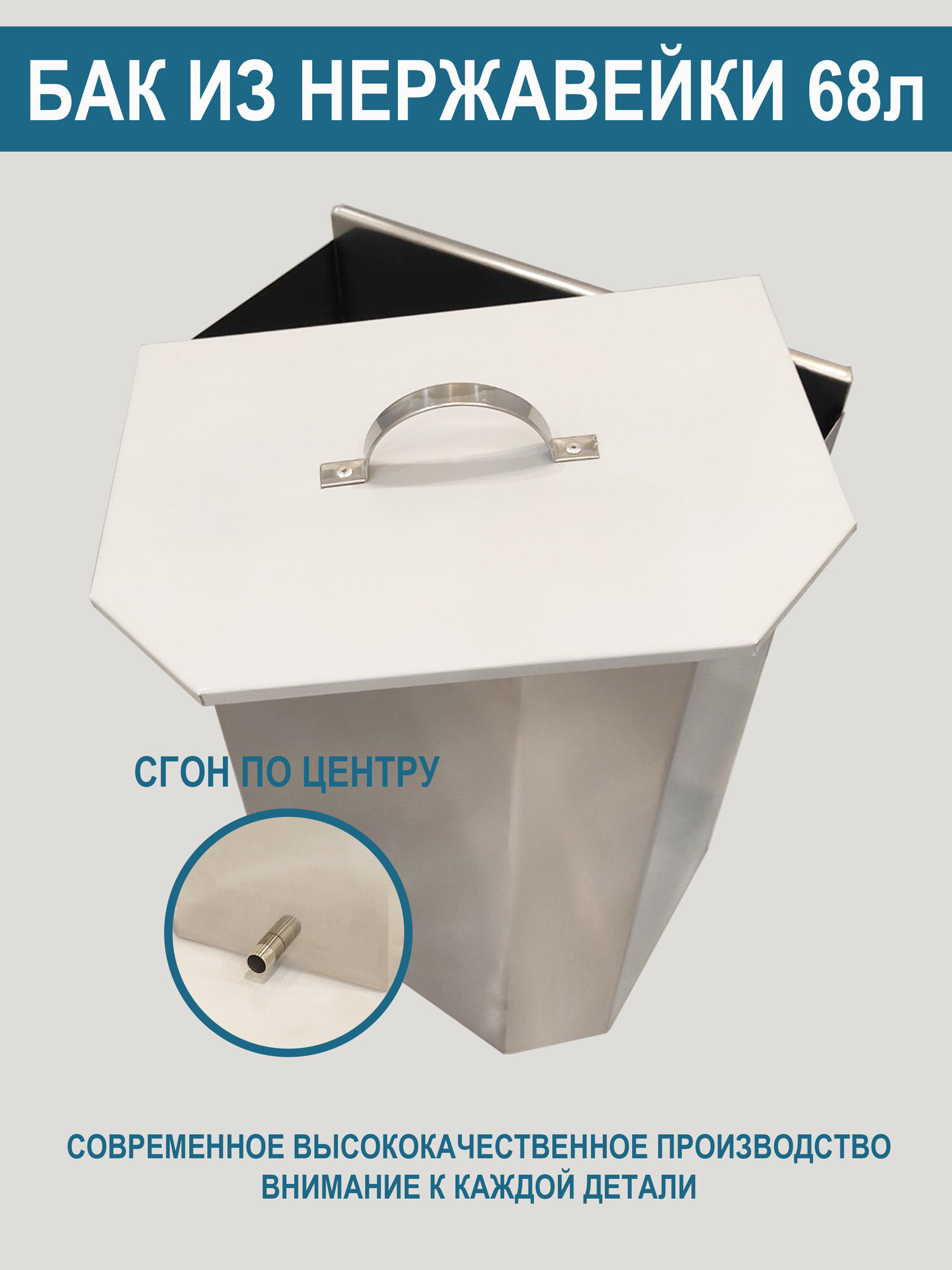 Бак из нержавеющей стали AiSi430 с крышкой, объем 68 литров, сгон по центру информация: